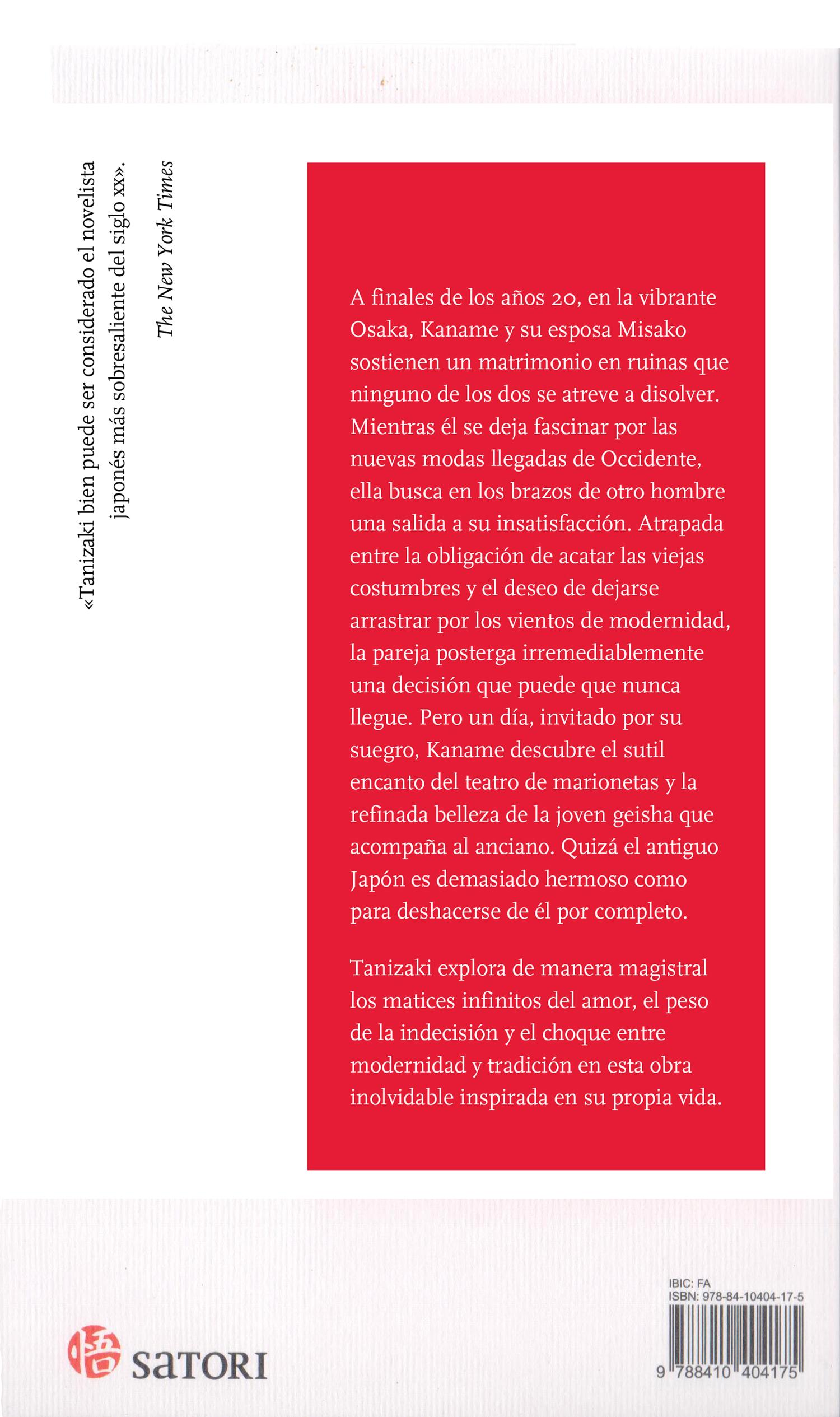 invito al teatro Benten 4 ». Kaname debería haberlo consultado con Misako, pero, como ella no estaba en casa, sin pensarlo respondió: «Probablemente sí acudiremos». Esa invitación se debía a que, en una ocasión, Kaname le había hecho un cumplido a su suegro con el fin de agradarle: «Hace mucho que no veo una obra de bunraku, así que, la próxima vez que vaya usted, avíseme sin falta». El anciano se lo había tomado al pie de la letra y por eso los había invitado, y a su yerno le resultó difícil negarse. Asimismo, dejando aparte la representación de títeres, pensó que esta podría ser la última oportunidad de pasar un rato tranquilo charlando con su suegro. El hombre, que frisaba los sesenta, se había retirado a Shishigatani5 , en Kioto, y llevaba un estilo de vida elegante y conservador aunque algo extravagante. Por supuesto que Kaname no compartía sus aficiones y a menudo lo cansaban sus demostraciones de buen conocedor de todo. No obstante, habiendo sido un vividor en su juventud, tenía un aire refinado y desenvuelto que atraía a Kaname, a quien le daba pena pensar en que pronto dejarían de ser suegro y yerno. Con cierta ironía podría asegurar que sentiría más apego por este anciano que por su propia esposa tras divorciarse. Y por eso, mientras aún estaba casado, deseó hacer algo que normalmente no haría: portarse como un buen yerno