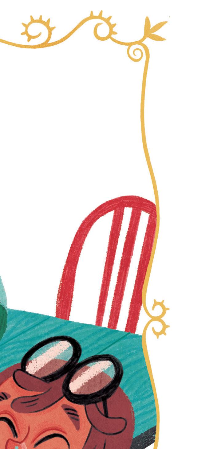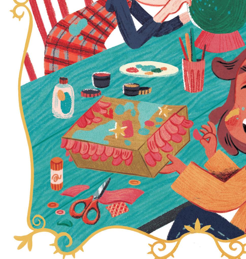Marina y ella estaban sentadas en la cocina de la abuela Amelia. En la mesa había todo tipo de materiales: goma de colores brillantes, pegamento, cartulinas, bolígrafos plateados y purpurina. También un plato de galletas de chocolate y dos vasos con zumo de naranja a medio terminar.
