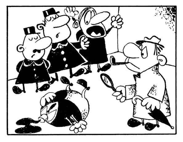 cuenta en efecto una historia protagonizada por un inspector cuyo nombre, cuya cara de tortuga triste y cuya pipa eterna remiten a Jean Gabin —o más bien al Jean Gabin que interpretó al comisario Maigret—; su atmósfera se halla tal vez más cerca del cine francés de la posguerra que de la serie negra norteamericana. Ahora bien, igual que ocurre en sus novelas y relatos iniciales, Suárez se acoge aquí al esquema policial solo para dinamitar todos y cada uno de sus tópicos, para desmontar las convenciones a las que parece acogerse y para construir así una narración sarcástica, irreverente y dominada por un humor absurdo, gamberro y plagado de retruécanos («El vecino del segundo imploró al detective para que no le despeinara porque venía de la peluquería», dice el narrador. «Tenía solo seis pelos en la cabeza y todavía menos en la lengua, hablaba por los codos y confesó su asesinato con pelos y señales»). Este libro, sin embargo, no es una novela ni un relato, sino un tebeo, un cómic concebido mucho antes de que el cómic empezara a dejar de ser entre nosotros un entretenimiento infantil y empezara a reivindicarse, bien