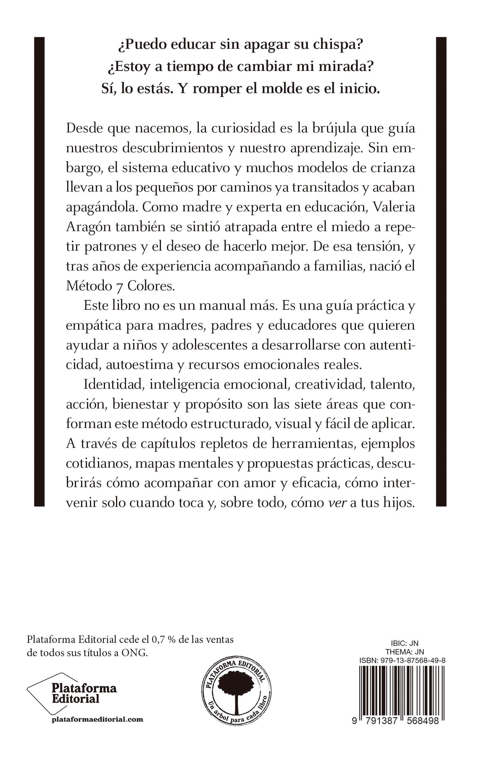 A partir ahí, entramos a profundizar en los 7 colores (áreas) del método: Identidad, Inteligencia emocional, Creatividad, Talento, Acción y Objetivos, Bienestar y Propósito. Con un capítulo dedicado a cada uno de ellos, podrás tener una base clave sobre: en qué consisten, por qué son fundamentales para el desarrollo integral de tu hijo, algunos ejemplos y cómo puedes empezar a ponerlos en práctica. Al