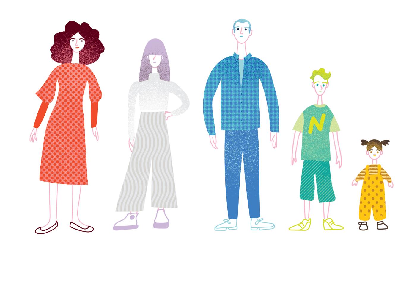 Coral y Celestino son los padres de la familia. Tienen tres hijos: Blanca, una adolescente de 14 años; Neón, un niño de 9 años; y Mostaza, una niña de 2 años. Un detalle, hay muchos tipos de familia hoy en día, esta es una más cuyos