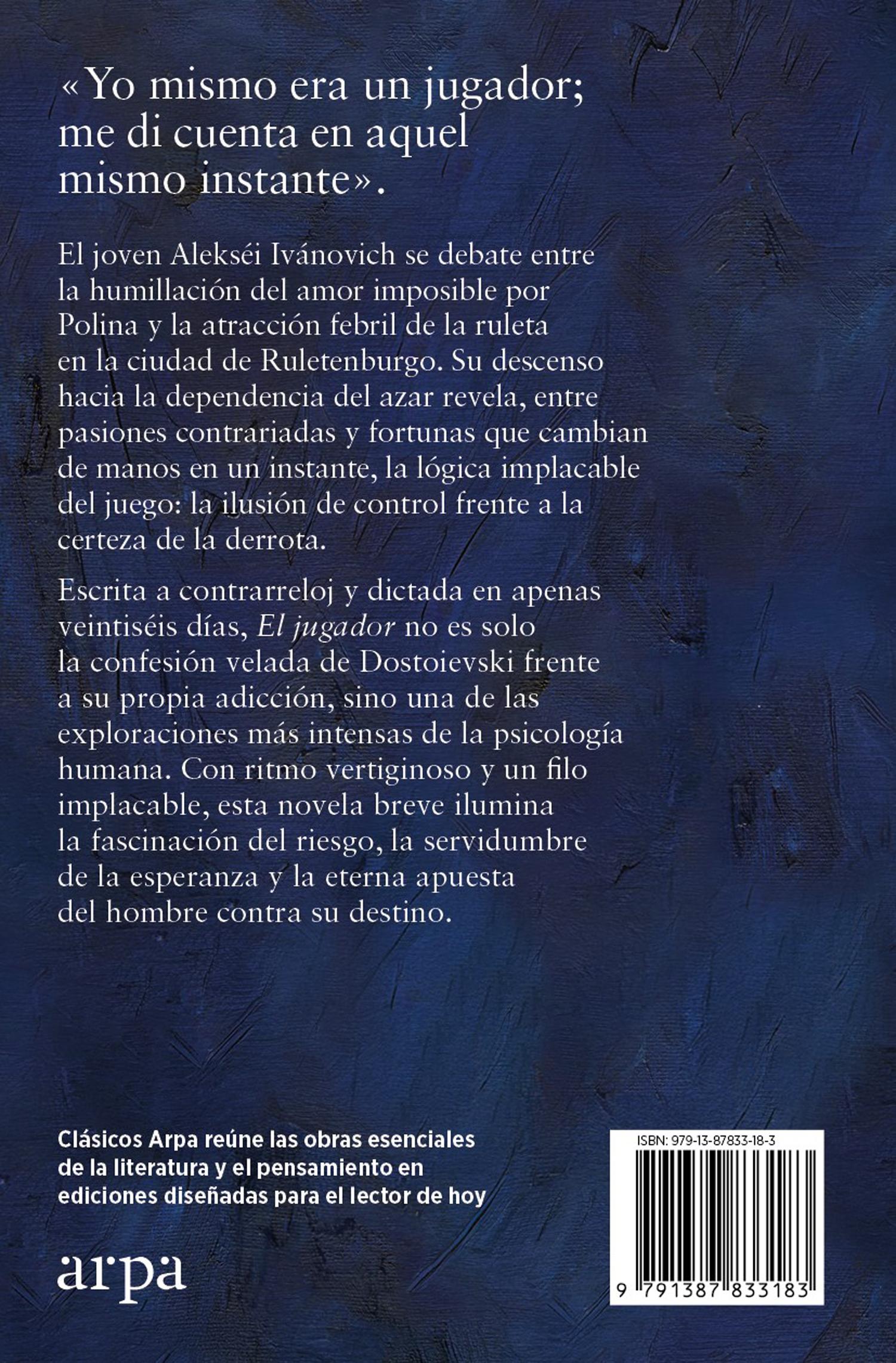 No obstante, tengo mis órdenes: ganar a la ruleta sea como sea. No tengo tiempo para pensar en sus motivaciones: pensar por qué, o cuán rápido, tengo que ganar, o bien qué nuevas ideas han surgido en esa cabecita suya que siempre está intrigando. Además, durante estas dos semanas un buen montón de sucesos se han sumado a la pila, hechos que aún desconozco. Todo esto tiene que ser meditado, investigado, cuanto antes mejor. Pero por ahora no hay tiempo que perder: debo jugar a la ruleta.