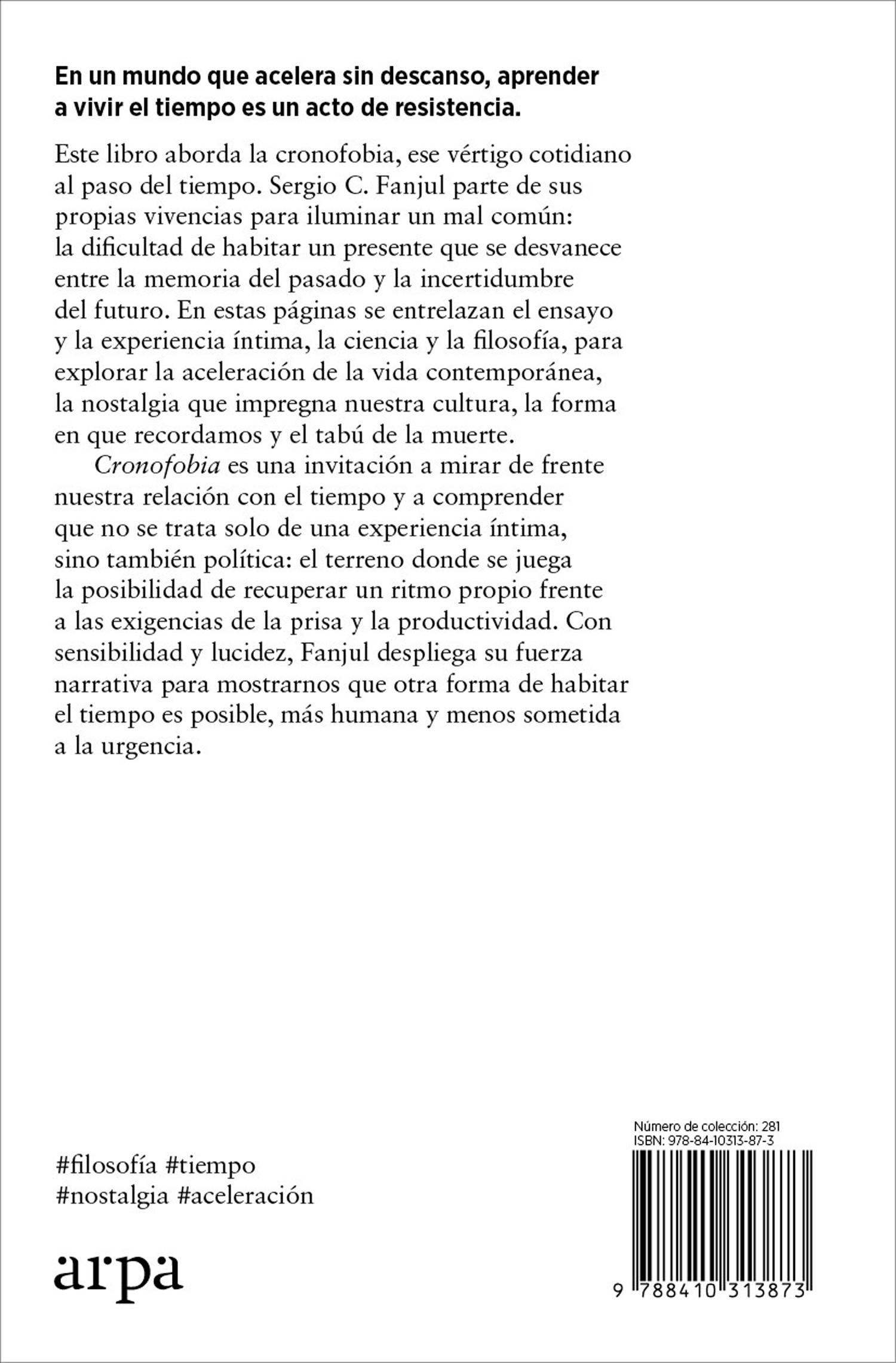 En adelante exploro los síntomas de mi cronofobia, pero también las ideas que los seres humanos han desarrollado para comprender esa cosa incomprensible que es el tiempo. Las teorías científicas, filosóficas o culturales en torno al tiempo. La aceleración contemporánea que aumenta a cada rato la velocidad vital y que hace desaparecer el tiempo libre. Me intereso por los fenómenos de la memoria, por la nostalgia que caracteriza nuestra época y por las visiones que podemos albergar del futuro cuando el futuro parece abolido. La concepción del tiempo depende en cada época de las concepciones culturales y los procesos históricos, el tiempo está condicionado por la tecnología, la economía y la política. Y, de hecho, es una cuestión política la forma en la que organizamos nuestro tiempo de vida, es decir, nuestra vida, y por eso ahí se abre un campo para el estudio y la reivindicación de otros ritmos temporales. La revolución temporal es la gran revolución del tiempo propio contra el tiempo del trabajo, de las obligaciones impuestas, de la explotación, el tiempo que tiene las manos de otros encima y que nos aprisiona: es la revolución más hermosa que podemos imaginar. Al final voy a dar a la muerte, qué nervios, a donde nuestras vidas van a dar igual que los ríos van a dar a la mar, que es el morir. Porque tal vez el miedo al paso del tiempo no esconda más que el muy comprensible y muy humano miedo a la muerte. La sociedad contemporánea, sostengo, es de naturaleza cronófoba. Se nota en sus relaciones difíciles con el futuro abolido y la nostalgia creciente ante pasados que parecen dorados pero que seguramente no lo fueron. Se nota en la creciente aceleración que invade todos los ámbitos de