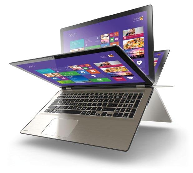 La Toshiba Satélite P55Wt es vanguardista y multifuncional, y se transforma para brindar el máximo desempeño en distintas situaciones. La pantalla táctil gira 360˚, permite satisfacer diversas necesidades: usarla como una laptop convencional o con pantalla trasera, ideal para presentaciones, o bien como una tableta. Tiene un procesador Intel Core i7, 8 GB de memoria ram y disco duro de 750 GB; calidad de audio dts, webcam hd, Bluetooth 4.0, ranura para tarjetas de memoria y puertos USB 3.0.
