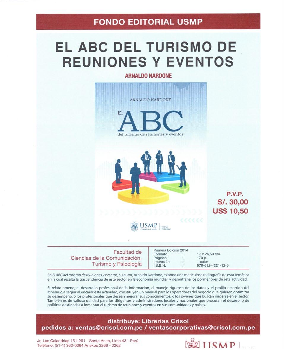 “El objetivo de este libro es que, cuando un ministro o un director de turismo, un gerente de hotel o de un centro de convenciones asuma sus funciones tenga a la mano un manual básico que lo ayude a desempeñar su trabajo,” explicó Arnaldo Nardone, presidente de la de libro. Editado por la Universidad San Martín de Porres, está compuesto de tres partes: “La actividad turística en la economía”, “Segmentos que integran el turismo de reu niones y eventos”, y “Gestión eficiente del desarrollo de un destino”. Muy útil. (170 pp.)