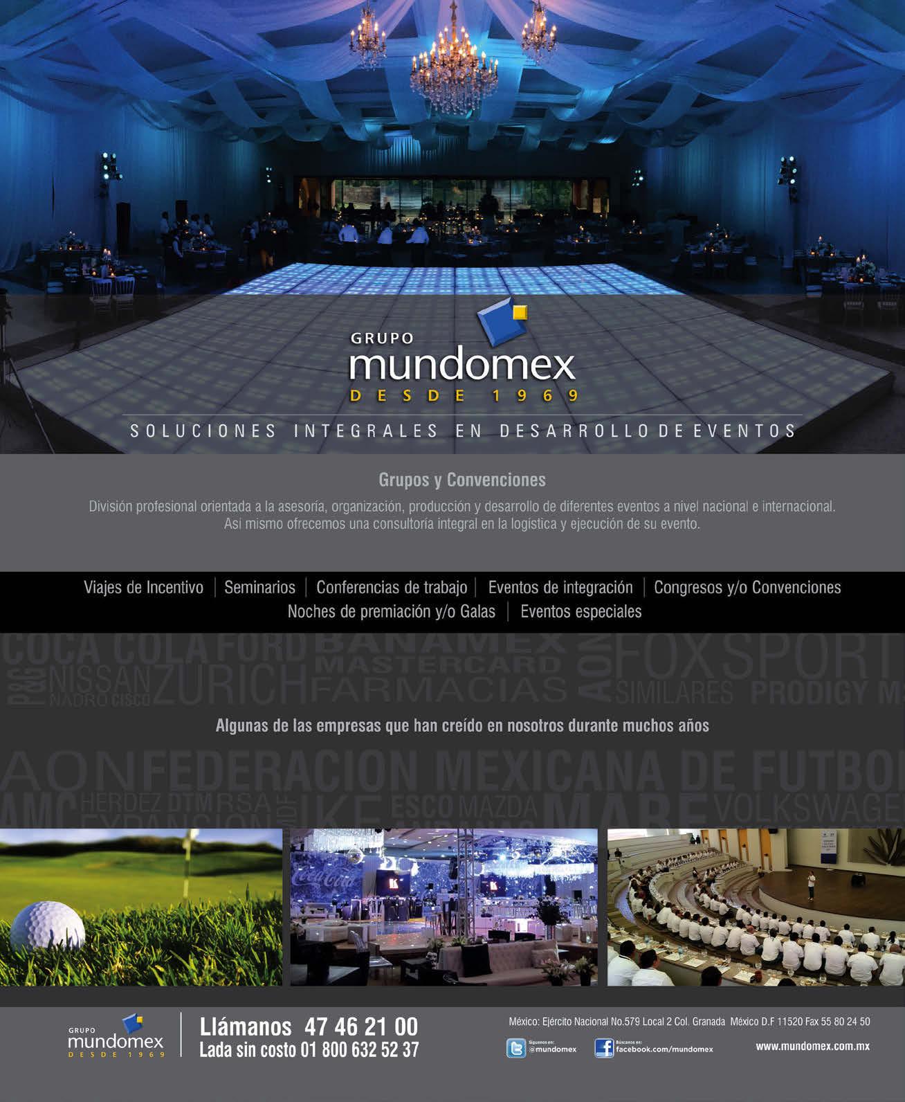 ©2015 MDC THE MEETING PLANNER’S MAGAZINE. Edición 106, febrero 2015. Editor responsable: José Natividad Sandoval Zepeda. Número de certificado de reserva otorgado por el Instituto Nacional del Derecho de Autor: (04-2012-061213170600-102). Número de Certificado de Licitud de Título y Contenido: 15645. Registro Postal PP09-1894. Certificado de circulación, cobertura y perfil del lector folio 00327-RHY emitido por Romay Hermida y Cía S.C., y registrado en el Padrón Nacional de Medios Impresos de la SEGOB. Publicaciones Periódicas del Servicio Postal Mexicano. Domicilio de la publicación: Platón 414, Polanco, 11560, Miguel Hidalgo, México, D.F. Tel: (55) 5281 1200. Imprenta: GRUPO INFAGON. Alcaiceria 8, Col. Zona Norte Central de Abasto, 09040 México, D.F. Tel: 01 (55) 5640 9266 www.infagon.com.mx, México, D.F. Fecha de impresión 26 de febrero. Distribución locales cerrados: Pernas y Cía., Editores y Distribuidores S.A. de C.V. Poniente 134 No. 650 Col. Ind. Vallejo Delegación Azcapotzalco, 02300 México, D.F. Tel: 01 (55) 5587 4455. Orange Grupo Editorial investiga sobre la seriedad de sus anunciantes, pero no se responsabiliza de sus ofertas. El contenido de los artículos no refleja necesariamente la opinión de los editores. Todos los derechos reservados. Prohibida su reproducción parcial o total, incluyendo cualquier medio electrónico o magnético, sin autorización por escrito del editor.