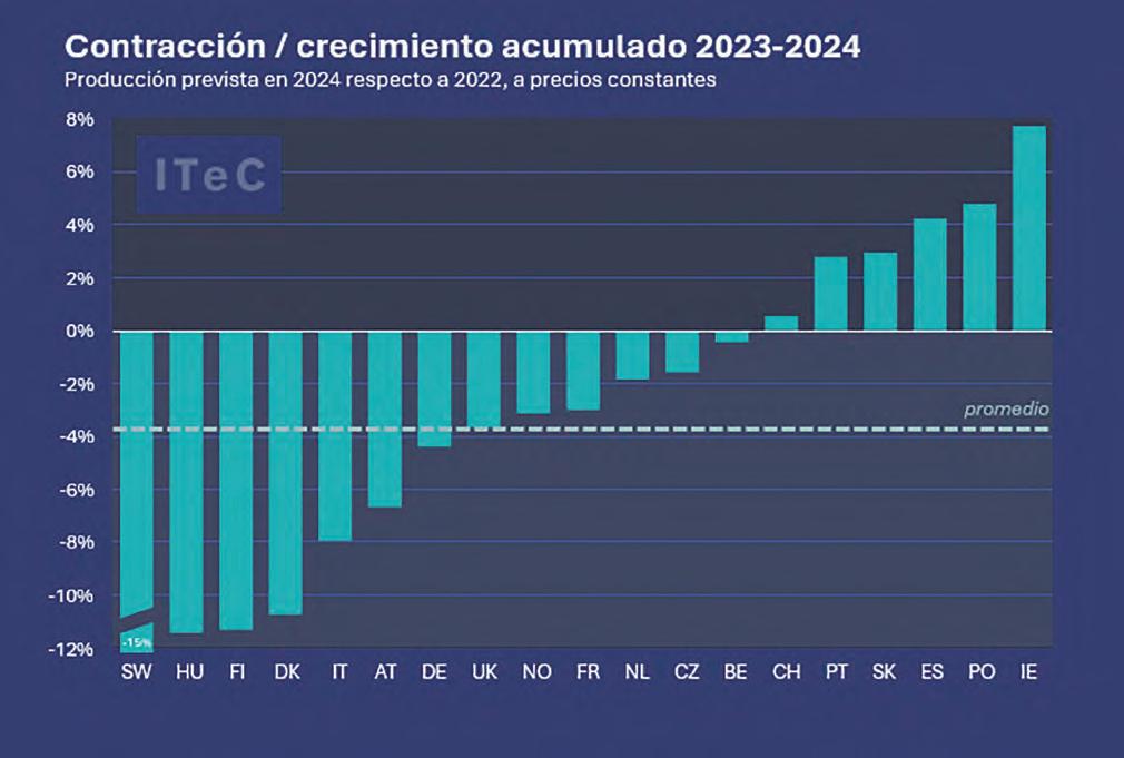 El paréntesis recesivo de 2023-2024 no tendrá muchas excepciones por países. Entre los diecinueve mercados analizados, únicamente hay seis que tienen previsto acabar el 2024 por encima del 2022, un grupo en el cual solo encontramos un mercado grande (España) y dos medianos (Polonia y Suiza).