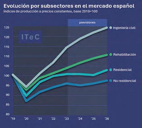 Evolución de los distintos subsectores en el mercado español. Índices de producción a precios constantes, base 2019 = 100. Fuente: ITEC-Euroconstruct.