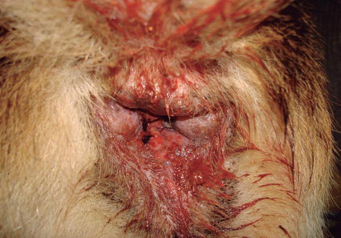 Se observaba la zona lumbar con cierta tricorrexis y al observar la zona anal, se presentaban fístulas en diferentes zonas del ano, con eritema y exudación.