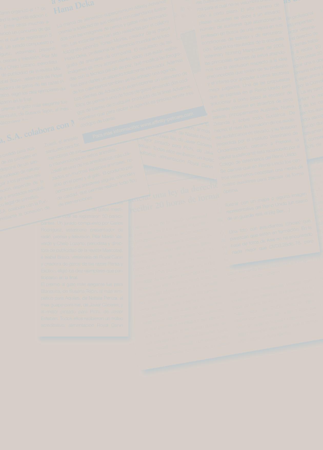 La responsabilidad de los artículos, reportajes, comunicados, etc. recae exclusivamente sobre sus autores. El editor sólo se responsabiliza de sus artículos o editoriales. La ciencia veterinaria está sometida a constantes cambios. Así pues es responsabilidad ineludible del veterinario clínico, basándose en su experiencia profesional, el correcto diagnóstico de los problemas y su tratamiento. Ni el editor, ni los autores asumen responsabilidad alguna por los daños y perjuicios, que pudieran generarse, cualquiera que sea su naturaleza, como consecuencia del uso de los datos e información contenidos en esta revista. De acuerdo con la normativa vigente en materia de protección de datos Grupo Asís Biomedia, SL., es responsable del tratamiento de sus datos personales con la finalidad de enviarle comunicaciones postales de nuestras revistas especializadas, así como otras comunicaciones comerciales o informativas relativas a nuestras actividades, publicaciones y servicios, o de terceros que puedan resultar de su interés en base a su consentimiento. Para ello, Grupo Asís podrá ceder sus datos a terceros proveedores de servicios de mensajería. Podrá revocar su consentimiento, así como ejercer sus derechos de acceso, rectificación, supresión, oposición, limitación y portabilidad enviando un correo electrónico a protecciondatos@grupoasis.com, o una comunicación escrita a Grupo Asís en Centro Empresarial El Trovador, planta 8, oficina I, Plaza Antonio Beltrán Martínez 1, 50002, Zaragoza (España), aportando fotocopia de su DNI o documento identificativo sustitutorio e identificándose como suscriptor de la revista. Asimismo, si considera que sus datos han sido tratados de forma inadecuada, podrá presentar una reclamación ante la Agencia Española de Protección de Datos (C/ Jorge Juan, 6. 28001 – Madrid www.agpd.es).