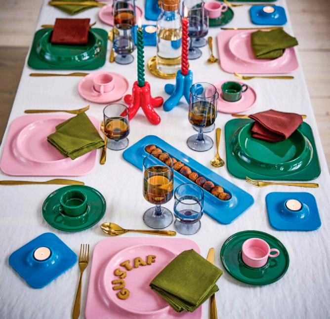 Monta una mesa de selfies con una colección para celebraciones modernas. Fuente, portavelas y taza con plato, todo de IKEA x Gustaf Westman.