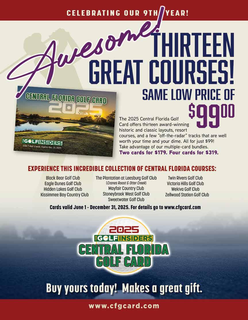 ©2025 Golf Central Magazine. No portion of this publication may be reprinted without the prior written permission of the Publisher. Editorial contributions are welcome, but Golf Central Magazine assumes no responsibility for unsolicited proposals, manuscripts and photographs. All materials submitted not accompanied by a self-addressed stamped envelope will not be returned. Mailing, electronic mailing or faxing of contributions constitutes an expressed warrant on the part of the contributor that all material is original and does not infringe on the rights of others. Golf Central Magazine retains all reprint rights and reserves the right to edit any submitted material to meet our specifications for publishing and or use in advertising or promotion. The Publisher and staff are not responsible for any loss or grievance by any person or persons whatsoever, due in any way or in part to the content of this publication. The Publisher reserves the right to refuse to accept any material deemed inappropriate or in bad taste.
