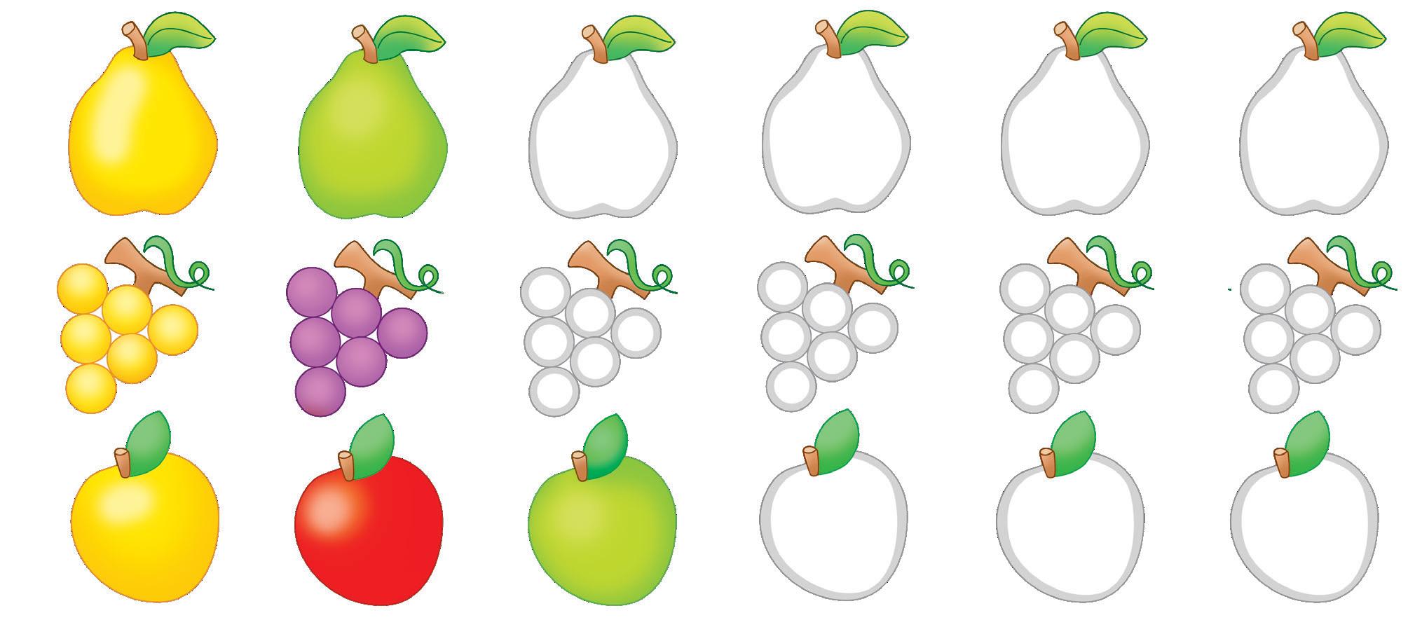 Descrie fructele de toamnă: formă, culoare, gust, cum pot fi consumate etc. Colorează le.
