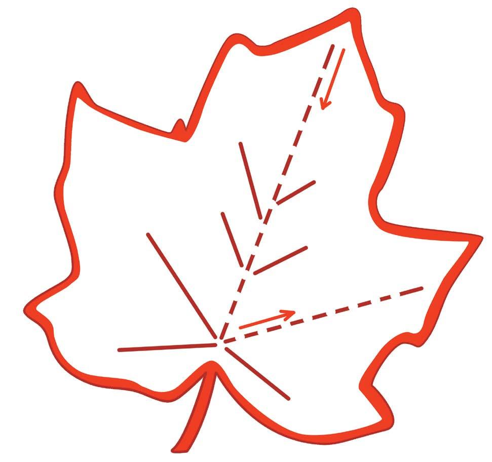 1. Continuă să trasezi pe liniile punctate, urmărind sensul dat de săgeți, nervurile frunzei.