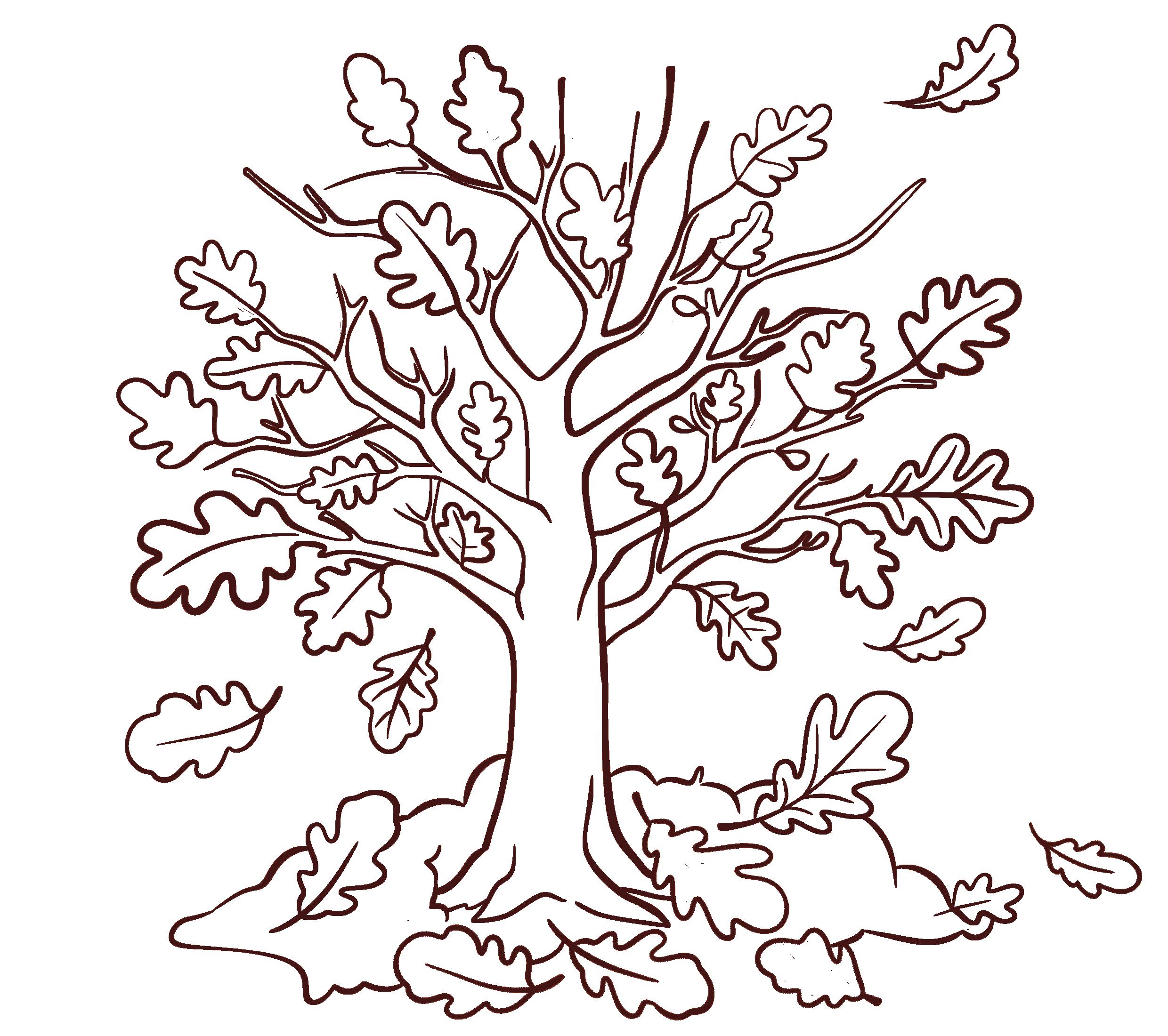 ✿ Spune ce vezi în imagine. Colorează frunzele care sunt sub copac. Desenează pe bancă trei frunze în culori de toamnă.
