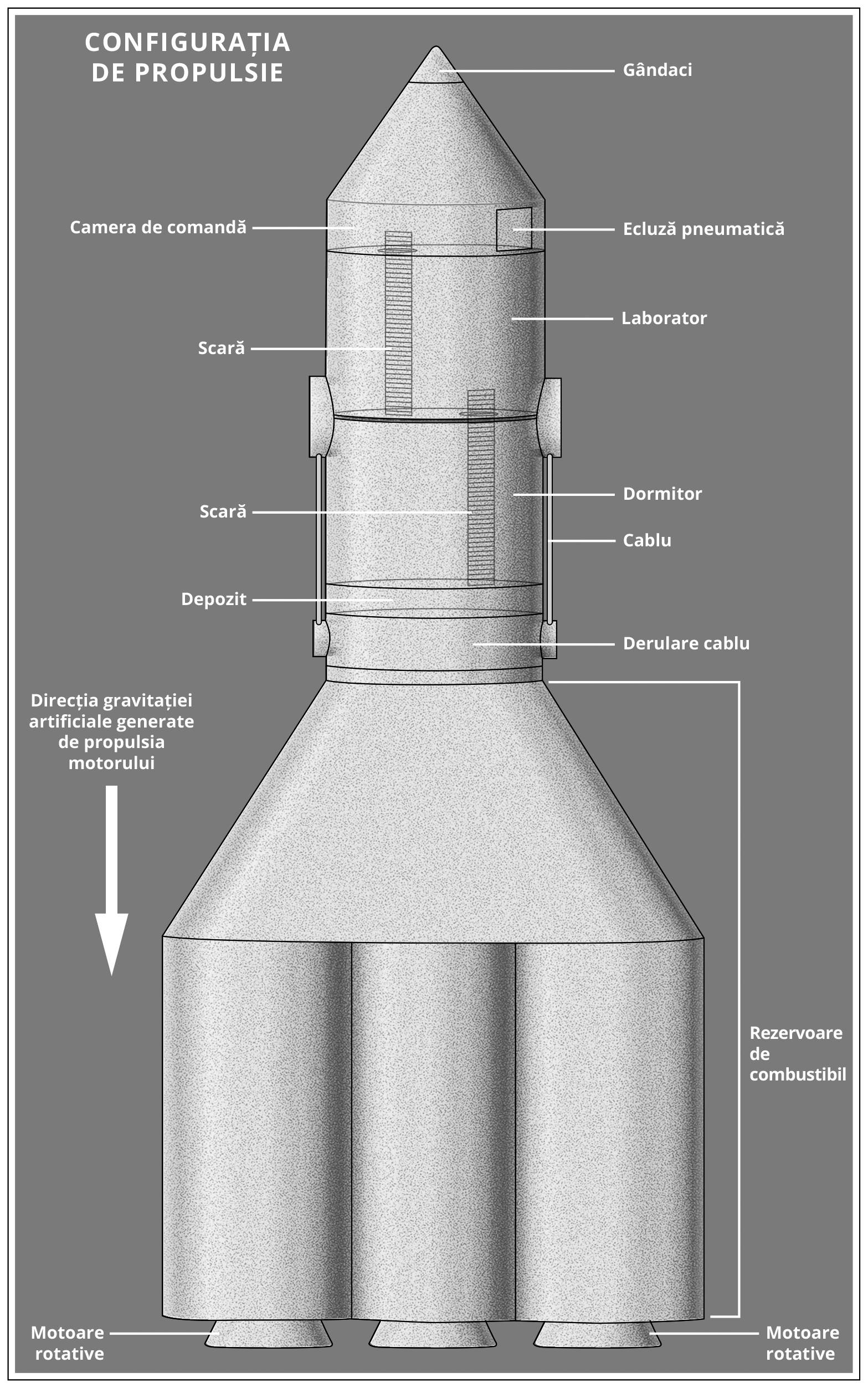 Nu există nicio ușă. Doar o scară pe perete care duce la… o trapă? Este rotundă și are în mijloc o roată de acționare. Mda, trebuie să fie un soi de trapă. Ca pe un submarin. Poate că noi trei avem vreo boală contagioasă. Poate că asta-i o cameră etanșă de carantină. Ici-colo pe perete există orificii mici de ventilare și simt un ușor curent de aer. Ar putea fi un mediu controlat.