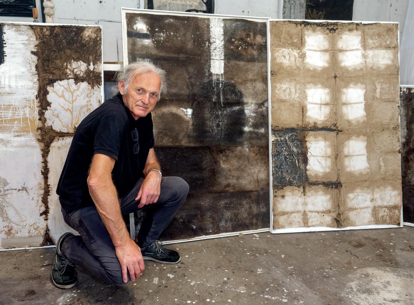 Nella paesaggistica ancestrale degli esordi, lontana dall’impressionismo per la predominanza del nero, l’oscurità è rotta da chiarori ottenuti dal materiale, la figu-