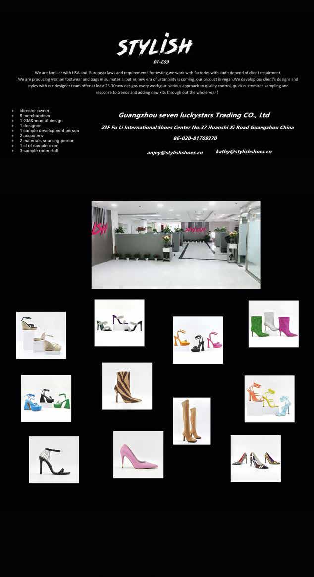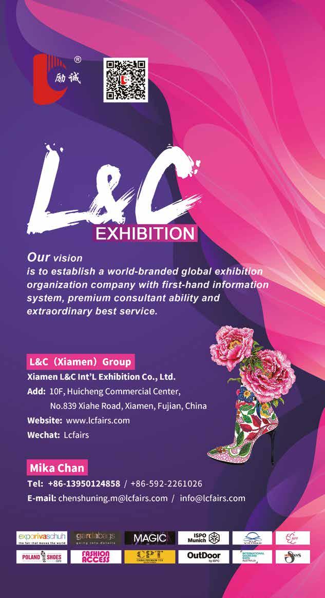 HENAN PROSPER SKINS & LEATHER ENTERPRISE CO., LTD. C1 F06 LUFENG FOOTWEAR CO. LTD C1 C12 OLICOM(JINJIANG)IMP & EXP CO.,LTD C1 A15 QUANZHOU PATOLL TRAVEL PRODUCTS CO.,LTD C1 G13 ROSWING FOOTWEAR (NINGBO) CO.,LTD C1 D06 WENZHOU INTERNATIONAL ECO.&TEC.COOPERATION CO., LTD C1 F07 WENZHOU JIEFENG IMP & EXP CO., LTD. C1 C14 XIAMEN L &C INT'L EXHIBITION CO., LTD. C1 F02 - F06 CHINA LEATHER PUBLISHER CO. LTD. C2 D23 GUANGZHOU ANAX FASHION SHOES CO., LTD C2 C22 GUANGZHOU ELENORA INTERNATIONAL FOOTWEAR CO., LTD C2 C28 GUANGZHOU NEWTOP EXHIBITION BUSINESS CO., LTD. C2 B11 - C11 - C22 - E05 QUANZHOU XINGRUI TRADE CO., LTD. C2 D04 WENZHOU BOBO SHOES INTERNATIONAL CO., LTD C2 E05 WENZHOU REGIS IMPORT & EXPORT CO., LTD. C2 E06 WENZHOU SUNWAY TRADING CO., LTD C2 B11 WENZHOU ZHONGXU TRADING CO., LTD. C2 C11 XIAMEN L &C INT'L EXHIBITION CO., LTD. C2 C28 - D04 - E06 YANCHENG YUJIE FOREIGN TRADE CORP LTD. C2 D23 ANCESTRAL SHOE CO LTD C3 A11 CHINA LEATHER PUBLISHER CO. LTD. C3 A11 - C14 - C17 - E16 G&F CO., LTD. C3 A09 - B01 - B02 - C05C21 - C23 GUANGZHOU NEWTOP EXHIBITION BUSINESS CO., LTD. C3 D02 - D04 - E17 - E19 - G13 GUANGZHOU TIANTONG SHOES CO. LTD C3 D02 GUANGZHOU TOUAREG SHOES CO., LTD C3 G13 HONGMIN GROUP INTERNATIONAL CO., LTD C3 C14 JINJIANG REBAR INTERNATIONAL CO., LTD. C3 C05 JINJIANG XIANGYUN IMPORT AND EXPORT TRADE CO., LTD. C3 A15 JINJIANG YESHEN IMP.&EXP.TRADE CO., LTD C3 B02 MAYLINK FUJIAN TRADING CO., LTD. C3 A19 MYM DIS TICARET LTD. STI. C3 A15 NINGBO HUAWIT IMPORT&EXPORT CO.,LTD. C3 C17 QUANZHOU WALKSUN TRADING LIMITED C3 B01 SHANGHAI SAB JIEMEI CO.,LTD. C3 E16 WENLING MINGYANG SHOES CO., LTD. C3 C21 WENZHOU JIEYUAN TRADING CO., LTD. C3 D15 WENZHOU TOPWAY FOOTWEAR CO., LTD C3 D04 WHOFIT FOOTWEAR MANUFACTURER C3 E19 XIAMEN GREASHIP CORPORATION C3 A09 XIAMEN JIASHENG FOREIGN TRADE CO., LTD. C3 A17 XIAMEN L &C INT'L EXHIBITION CO., LTD. C3 A15 - A17 - A19 - A32 - D15 XIAMEN PULLTOP TRADE CO., LTD. C3 A32 ZHEJIANG TIANCHEN IMPORT & EXPORT CO., LTD C3 E17 GUANGZHOU SUNNY BAGS CO., LTD D A02 ANHUI LIGHT INDUSTRIES INTERNATIONAL CO., LTD D C13 APARSO FUJIAN SPORTWEAR CO. LTD D B08 APARSO SPORTSWEAR CO. LTD D B08 BEST KEY D D07