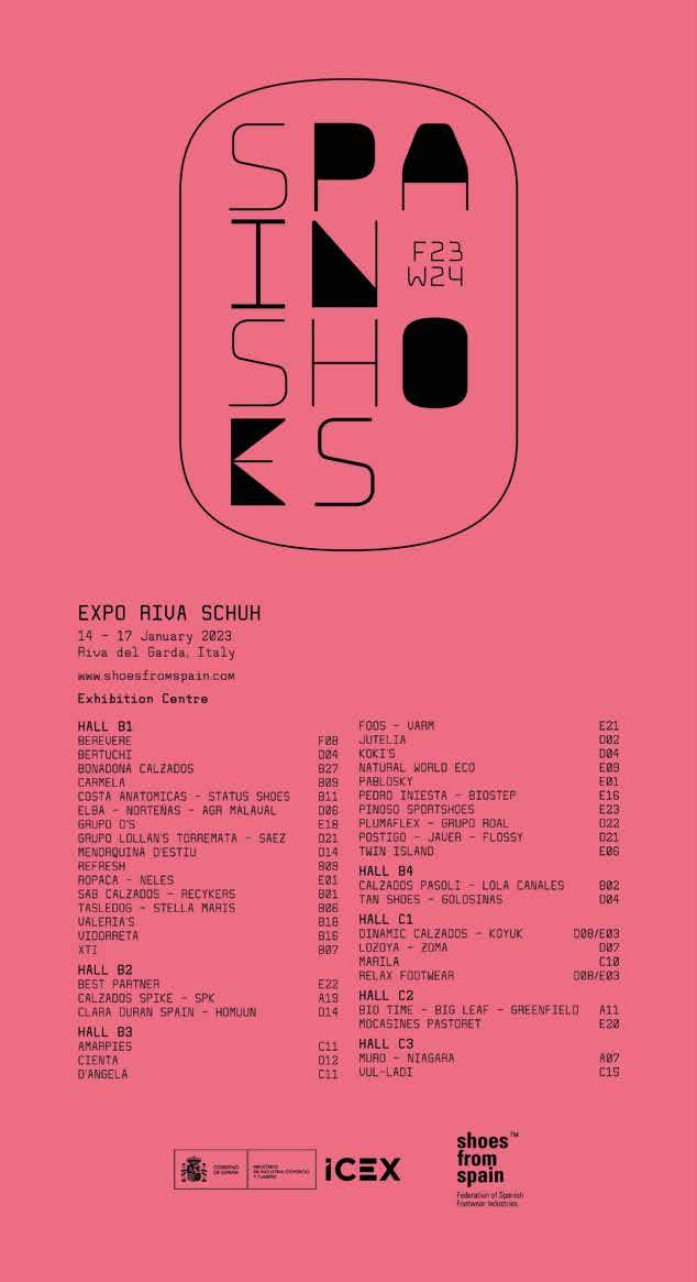 Espositore Company Pad. Hall Stand BERTUCHI - NEXT 51 B1 D04 CALZADOS BONODONA S.L. - MAYBE - BONADONA B1 B27 COSTA ANATOMICAS B1 B11 GENEX EUROPE S.L B1 C09 GRUPO DS B1 E18 GRUPO LOLLAN'S TORREMATA S.L. B1 D21 MARSAN FOOTWEAR, S.L. B1 B09 MENORQUINA D' ESTIU S.L.- FOR YOU SMILE - DANIVAL B1 D14 NOGHI B1 B25 NORTEÑAS - CALZADOS ELBA B1 D06 OIO SHOES - TASLEDOG - STELLA MARIS B1 B06 ROPACA - NELES B1 E01 SAB CALZADOS, S.L. B1 B01 TASLEDOG B1 B06 VALERIA'S B1 B18 VIDORRETA S.L.U B1 B16 XTI FOOTWEAR, S.L. B1 B07 ZAPATILLERIA ILICITANA B1 F08 BEST PARTNER CONSULTING SL B2 E22 BIOBIO FOOTWEAR B2 E22 CALZADOS SPIKE S.L. 'SPK' B2 A19 CLARA DURAN SPAIN S.L. B2 D14 EUROGLORIA,S.L. B2 C11 MACARENA - CALZADOS LARO SA B2 A27 CALZADOS CIENTA S.L. B3 D12 CALZADOS FUTURMODA S.L. - AMARPIES - D'ANGELA B3 C11 CALZADOS NEREIVA S.L. B3 E06 CALZADOS PABLO S.L.U. - PABLOSKY B3 E01 CALZADOS POSTIGO S.A.POSTIGO – JAVER – FLOSSY B3 D21 FLOSSY STYLE B3 D21 FOOTWEAR SOLUTIONS S.L. B3 E21 GENUINS FACTORY SL B3 F07 GROMO WORLD S.L. B3 E09 JAVER B3 D21 JUTELIA S.L. B3 D02 KALTUR SOURCING SL B3 A14 KOKIS - VULCANIZADOS LA MAJA S.L. B3 D04 PEDRO INIESTA S.A. B3 E16 PINOSO SPORTSHOES SL PINOSOS - FOOTCARE - COMODE B3 E23 PLUMAFLEX / GRUPO ROAL B3 D22 POSTIGO B3 D21 CALZADOS PASOLI SL B4 B02 CAMEL ACTIVE | CALZADOS KELLY S.L B4 E15 TAN SHOES SPAIN S.L.U B4 D04 CAUCHOS LO ZABALA, S.L. C1 D07 DINAMIC CALZADOS, SL - KOYUK C1 D08-E03 LOZOYA C1 D07 MARILA C1 C10 RELAX FOOTWEAR C1 D08-E03 ZOMA C1 D07 MAP SPAIN, S.L. C2 E20 MOCASINES PASTORET, S.L. C2 E20 PROCONTACT SHOES, S.L. C2 A11 GARRIDO MURO S.A. - MURO - NIAGARA C3 A07 VULCANIZADOS LADI S.L. C3 C15 CANADIAN JOHN S.L. D A25 D'FELINO D C06 FICE D A18 HAIKON HADA SL D C06 TIMONI D C06