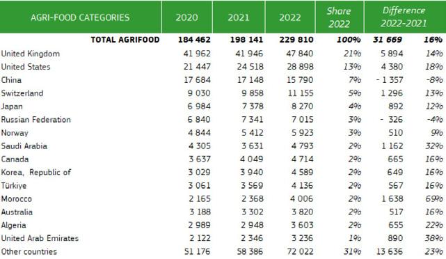 Exports of products of animal origin increased (+10%) and reached 45 billion euros, especially thanks to dairy products such as cheese, curds and milk serum. With over 14 billion euros, pork meat - despite a 5% drop - is still the number one exported meat product. As for imports, with over 20 billion euros, Brazil is still the first agri-food source for the EU - accounting for a 12% share in total and a 49% increase compared to 2021. Right behind, there’s the UK with 15.2 billion euros (+28%) and Ukraine with 13 billion euros (+88%). Cereals, vegetable oils and sugar are among the products with a major increase in volume.