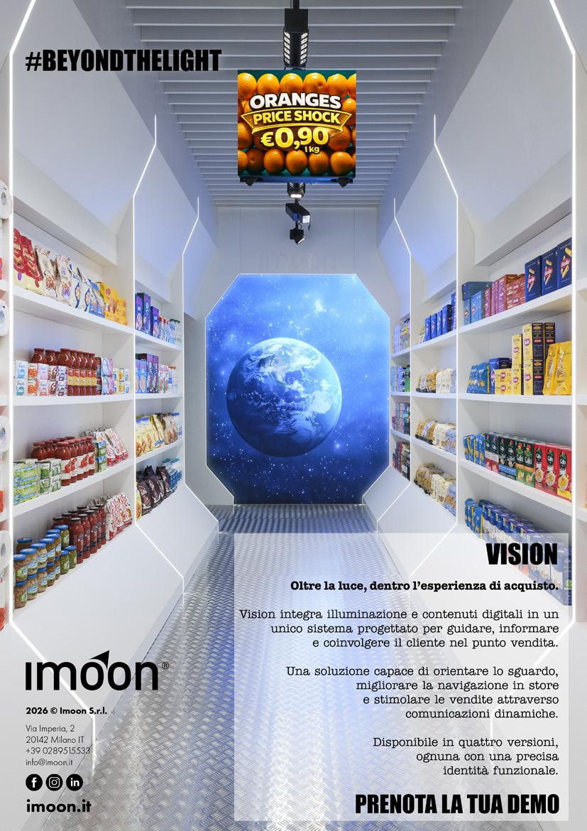 A EuroShop 2026 Imoon ha presentato un approccio completamente rinnovato al tema dell’illuminazione, proponendola come una vera infrastruttura capace di supportare comunicazione, servizi digitali e percorsi esperienziali. «Il concept “Beyond the Light”, fulcro dello stand premiato con il Silver Award nella categoria XL degli Exhibitor Magazine’s EuroShop Awards – afferma Massimiliano Giussani, sales director Italy di Imoon – ha mostrato come estetica e innovazione possano fondersi in una visione evoluta di punto vendita. Per noi, la fiera è stata l’occasione per delineare con chiarezza un nuovo modello di retail. L’intento era far percepire la luce come un’infrastruttura che abilita efficienza, contenuti dinamici e interazione, superando la sua funzione tradizionale. Lo stand, ideato come un vero ambiente narrativo ispirato al linguaggio cinematografico, metteva in scena percorsi fluidi, scenografie e soluzioni integrate che dialogavano con la luce per mostrare come questa possa guidare il cliente, trasmettere informazioni rilevanti e accogliere in modo naturale sistemi digitali, sensori e applicazioni basate sull’intelligenza artificiale. Le soluzioni protagoniste del nostro stand sono state Service Track e Vision. Service Track è una struttura modulare che unisce in un’unica piattaforma illuminazione, alimentazione e dati. La sua configurazione permette un’installazione più veloce, riduce la necessità di interventi a soffitto e si prepara ad accogliere servizi futuri come audio, sensori e applicazioni AI. Vision introduce invece la possibilità di integrare moduli Led direttamente negli apparecchi illuminanti, trasformando la luce in un mezzo comunicativo. Questa soluzione permette di orientare i clienti attraverso segnali luminosi dinamici, trasmettere messaggi aggiornabili e veicolare informazioni operative».