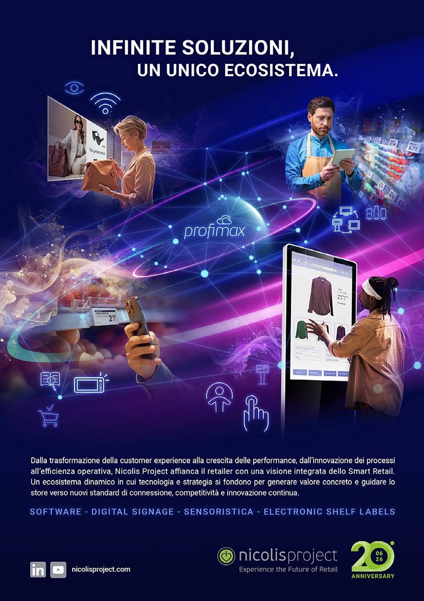 Vincenzo Parisi, cco di Nicolis Project, afferma che la partecipazione a EuroShop 2026 ha rappresentato per l’azienda un momento particolarmente significativo, soprattutto perché si è svolta nell’anno del suo 20° anniversario: «Un traguardo che non è solo simbolico, ma riflette un percorso di crescita continua, fatto di investimenti in ricerca, collaborazioni consolidate e una visione tecnologica sempre orientata al futuro. Celebrare vent’anni di attività proprio in questo contesto ci ha permesso di ripercorrere l’evoluzione dell’azienda e, allo stesso tempo, di mostrare come le nostre soluzioni abbiano saputo trasformarsi per anticipare i bisogni dei retailer e dei consumatori. In fiera abbiamo voluto raccontare una visione di punto vendita sempre più orientata alle esigenze e alle aspettative del consumatore finale: un ambiente in cui informazione, servizio e personalizzazione convergono per creare un’esperienza d’acquisto fluida e coinvolgente. Allo stesso tempo, questa visione non perde mai di vista le necessità dei retailer, che chiedono soluzioni capaci di ottimizzare i processi, ridurre le complessità operative e aumentare le performance di vendita. Ed è proprio in questo equilibrio che si colloca il valore distintivo delle nostre soluzioni: tecnologie che uniscono innovazione e concretezza, capaci di offrire non solo un miglioramento dell’esperienza in-store, ma anche risultati tangibili in termini di efficienza, controllo e incremento delle vendite».