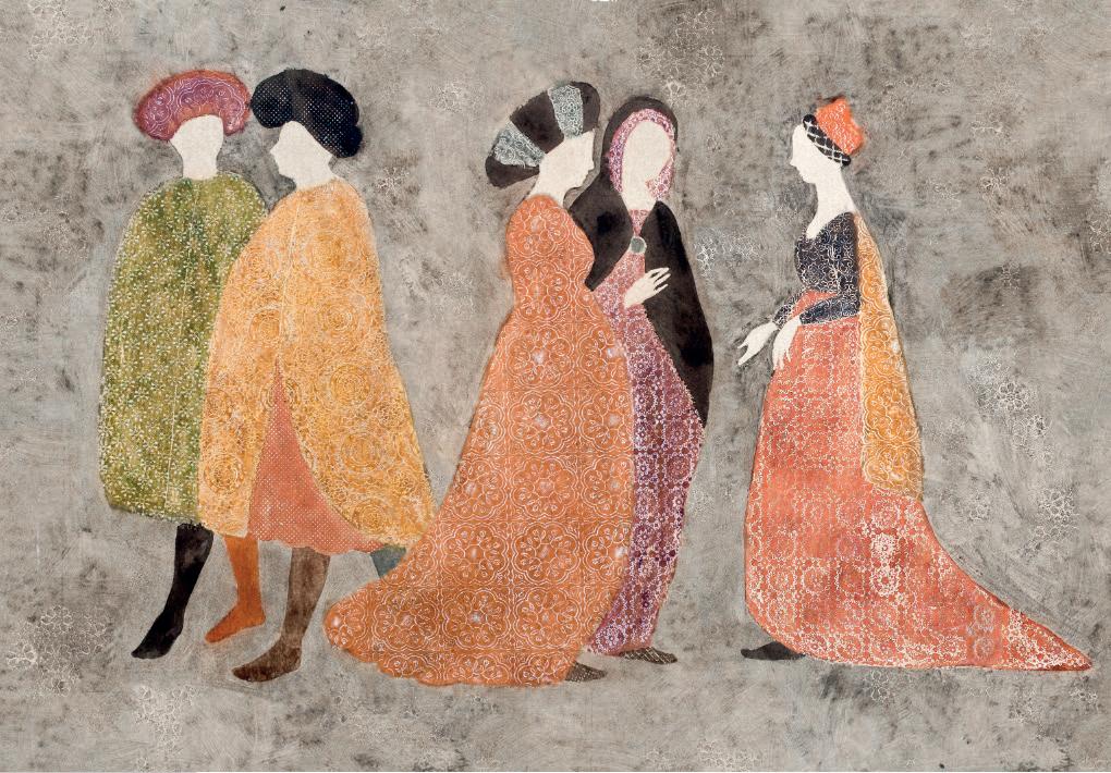 mi piace molto guardarmi intorno, libri, film mostre di arte, sono moto sensibile al mondo delle arti applicate e dell’artigianato popolare, e alle espressioni artistiche di altri continenti. non credo di averne uno specifico. Però mi sono sempre interessati quegli artisti capaci di indagare con la loro arte i più svariati settori, un nome fra tutti Sonia Delaunay. Il tuo modus operandi: poiché mi occupo di pittura, decorazione, illustrazione e progettazione di libri, tutte queste attività entrano in relazione fra loro, e si contaminano. La ricerca svolta in un ambito, può passare in un altro modificandosi. Per fare un esempio, il soggetto Agorà di Wall&decò proviene, debitamente modificato e studiato, dalle illustrazioni per il libro “Dame e Cavalieri” di Topipittori, casa editrice con cui collaboro.