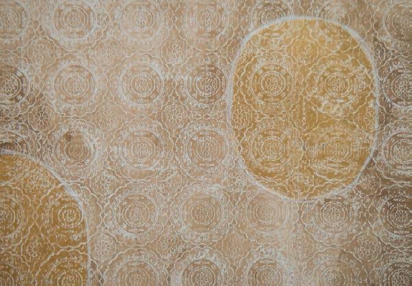 Carta decorata a mano, frottage, foglia d’oro applicata su pannello, showroom Kenzo a Parigi (art director Antonio Marras).