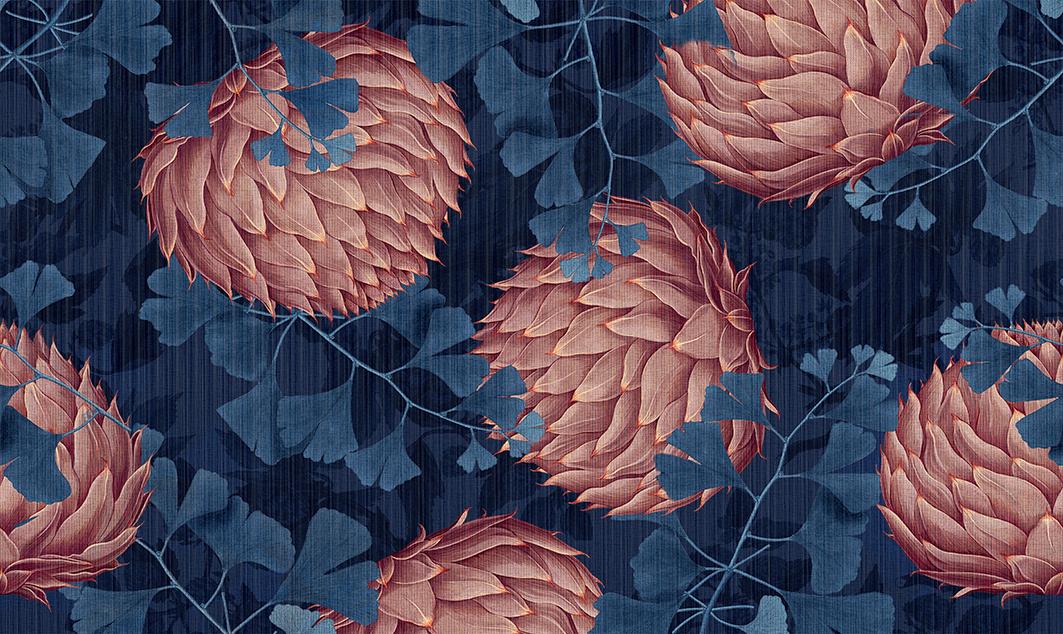 Ed eccoci ai soggetti per carte da parati… La collaborazione con Wall&decò, iniziata dieci anni fa, è stata la svolta, il punto professionale in cui sono riuscita a far convergere tutto ciò che avevo fatto in quel momento: decorazione, pittura, illustrazione. All’inizio la direzione artistica era interessata alla mia ricerca materica, poi lavorando insieme anche il mio modo di operare si è evoluto. Oggi parto da immagini analogiche per integrarle