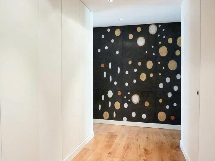Carte decorate a mano, inchiostri, cera, foglia d’oro applicata su pannello, casa privata a Milano (progetto studio di architettura Stefania Beltrame Sandra Gelmetti Architetti Associati).