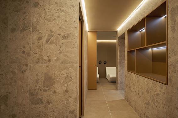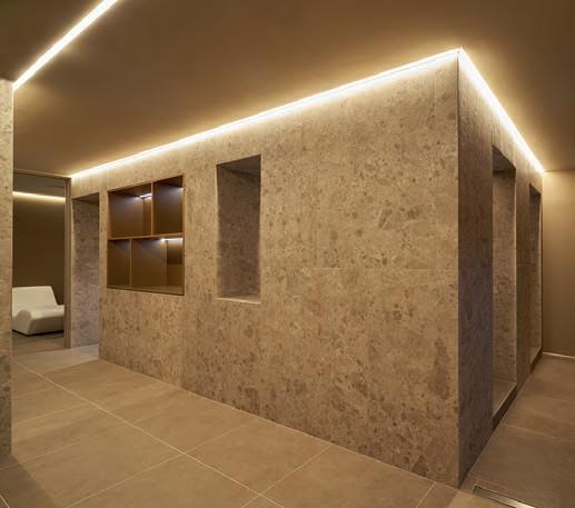 Il progetto di ristrutturazione per la realizzazione di una SPA nell’Hotel Franz a Gradisca d’Isonzo. Per questo progetto siamo partiti da un’idea di SPA in quanto luogo di cura e introspezione, creando quindi degli spazi rivolti all’interno e favorevoli alla contemplazione. Per quanto riguarda il disegno degli spazi e i materiali abbiamo scelto, ad esempio: effetto ceppo di gres sulle superfici verticali e a pavimento un effetto e colore terra. Questi hanno reso possibile la volontà progettuale della definizione dell’ambiente tramite la costruzione di volumi. Per enfatizzare quest’idea, l’illuminazione è stata collocata sul perimetro, rendendo così più visibile la matericità dello spazio.