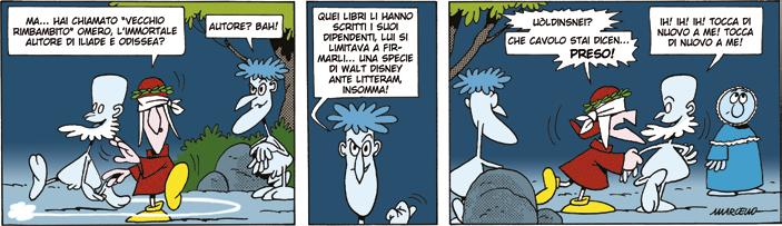 Vanno pure citate di Toninelli, tra le tante cose da lui prodotte, Gerusalemme liberata entrambe sempre a fumetti. Ma l’elenco delle sue riscritture fumettistico-parodiche potrebbe continuare con un’autentica galleria di simpatici personaggi e di mirabili storie uscite dalla sua penna-matita, compresi i poemi omerici, e Odissea