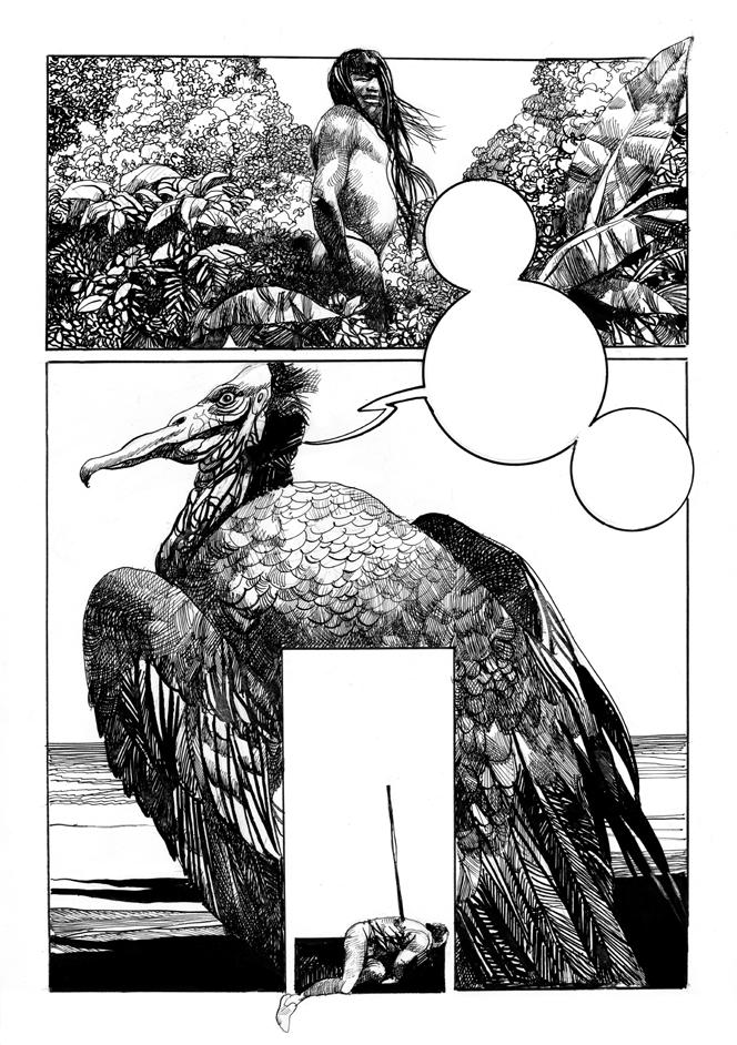 Con Ipotesi 1492 Toppi passa invece a un atteggiamento del tutto diverso, pur rimanendo nella prospettiva di un gioco con la realtà storica, dove l’ammiccante senso del gioco è molto più scoperto, perché il racconto – del tutto paradossale – usciva in rivista nel 1992, come befardo coinvolgimento nel contesto del gran chiacchiericcio mediatico di quel periodo, quando cioè nella realtà si celebrava il cinquecentenario del viaggio di Colombo e della scoperta “delle Indie”, ossia l’America. Il racconto si apre già in una prospettiva surreale. Toppi dà voce a un uccellaccio, un singolare narratore: il condor Zemì-Tawani, rammentatore per il suo Cacique, signore dell’isola in cui l’azione è ambientata. Il condor dichiara di ricoprire l’incarico di “rammentatore”: «Osservare tutto ciò che avviene nel corso delle stagioni… per rammentarlo poi a chi deve incidere i sacri pali della memoria». Egli è dunque il custode della memoria di un paese esotico, nel quale dobbiamo evidentemente immaginare una tribù primitiva, indigena di un paese al di là dell’oceano (sapremo poi, alla tavola 8, trattarsi dell’isola di Guanahani, che gli storici ritengono il primo approdo americano di Cristoforo Colombo, il 12 ottobre 1492). Conclude dunque il condor: «Un compito molto apprezzato dal mio signore. Ne ricavo prestigio, cibo e poca fatica». In relazione a quanto detto in precedenza sappiamo che proprio la Storia è la registrazione della memoria, ossia un’entità sacra – che, come ha ricordato Stefano Gorla nel contesto della presentazione di un volume su Toppi: