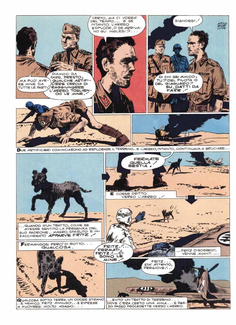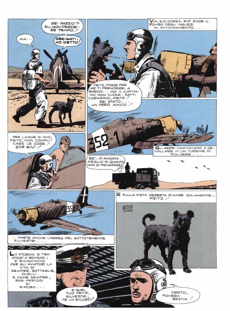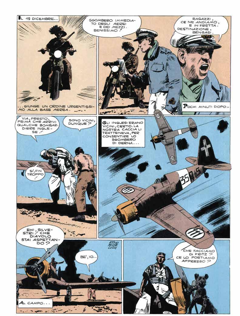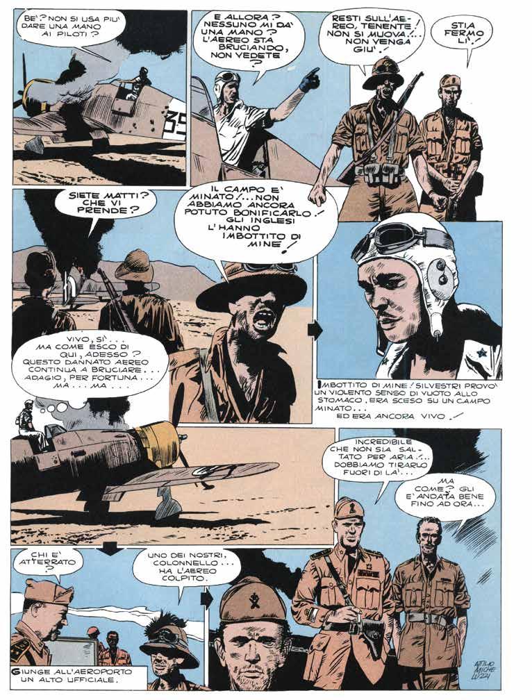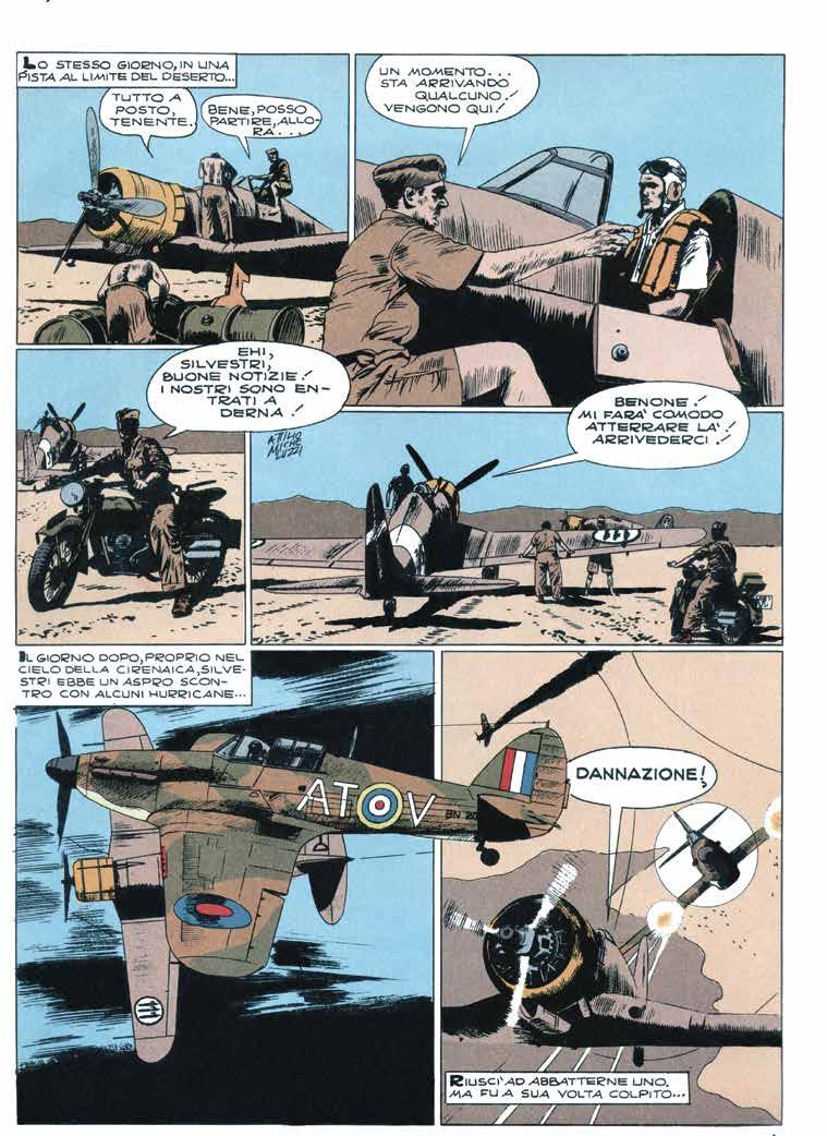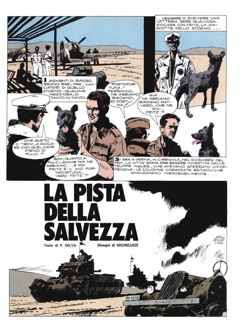 La pista della salvezza, è una storia pubblicata sul primo numero del 1974 della rivista, a colori, ambientata in Cirenaica, nel 1941, in piena “guerra del deserto”, e ha come protagonista un pilota da caccia italiano. L’episodio narrato potrebbe anche non essere mai accaduto o, più probabilmente, Milani (autore del testo, anche se qui si frma con uno dei suoi tanti pseudonimi “P. Selva”) lo ha estratto da qualche memoriale di guerra.