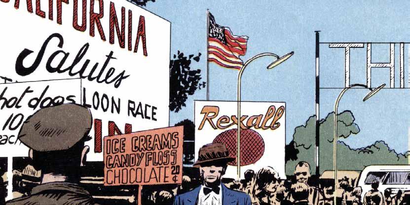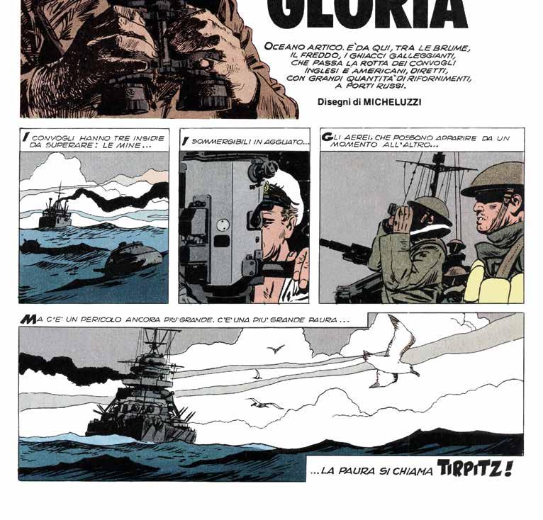 La corazzata senza gloria è ancora di Milani. Micheluzzi ha smesso di frmare le tavole, forse per la percezione che il suo stile è ormai conosciuto e inconfondibile, forse perché ritiene sufciente il nome sotto il titolo. Pubblicata a colori ma questa volta con una cura maggiore, forse seguendo indicazioni del disegnatore, ha per protagonista nientemeno che una corazzata tedesca, la Tirpitz. Ancora una volta Milani ci stupisce raccontando vicende profondamente umane senza protagonisti umani, fa pensare che per vedere qualcosa di simile altrove, ad esempio nel cinema, dovremo aspettare Dunkirk di Christopher Nolan, nel 2017! Micheluzzi stupisce, con tagli interessanti e a volte spettacolari, come nell’ultima vignetta della quinta pagina, in cui mostra un’inedita visione di bombardamento aereo.