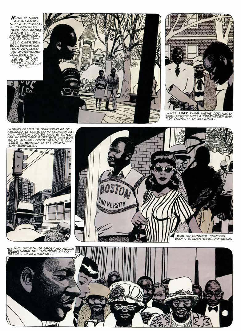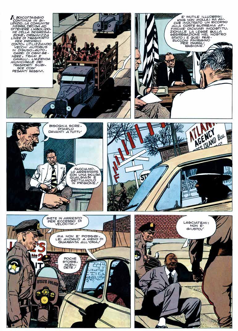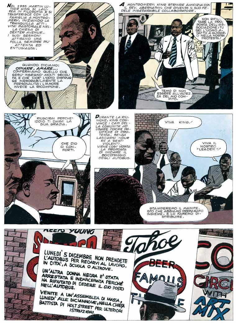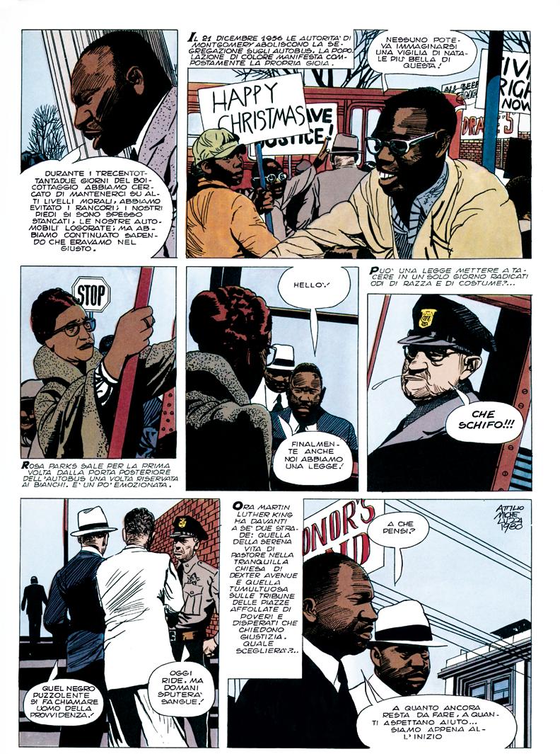 Oltre a una decina di canzoni e una manciata di apparizioni in opere cinematografche (compreso un flm animato), la vita di King è narrata in alcune biografe a fumetti, in particolare quella di Roudolph & Micheluzzi qui presentata, che parte opportunamente dall’episodio di Rosa Parks che avvia la protesta nel 1955, per poi dipanarsi negli avvenimenti più celebri, sapientemente orchestrati dalla sceneggiatura del genovese Raoul Traverso che (utilizzando come pseudonimo il cognome della moglie traduttrice dal francese) riesce mirabilmente a rendere in poche pagine i personaggi e gli avvenimenti con efcace realismo, senza rinunciare a ruvidezze dei protagonisti né alle minuzie della vita quotidiana, splendidamente servito dalla regia con taglio cinematografco del disegnatore istriano già al massimo della forma nel 1980 (anno di realizzazione del trittico di puntate).