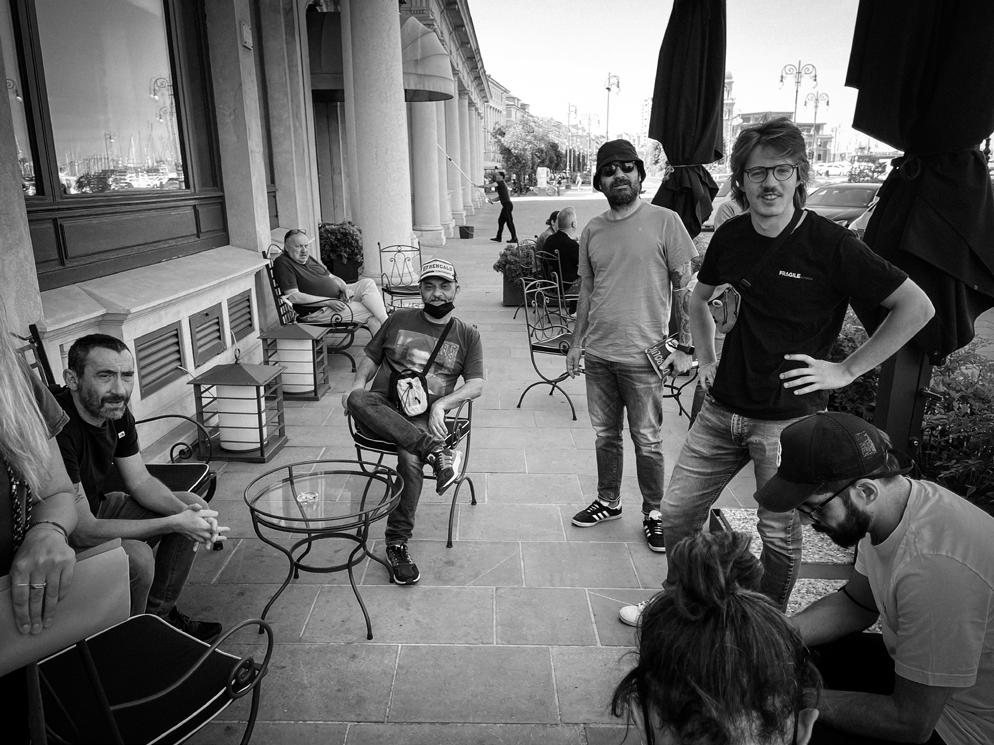 Il presidente della Film Commission Friuli-Venezia Giulia Federico Poillucci , Antonio e Marco Manetti , dietro il direttore della fotogra f ia Angelo Sorrentino, Niccolò Falsetti, il location manager Alessandro Coleschi e io.