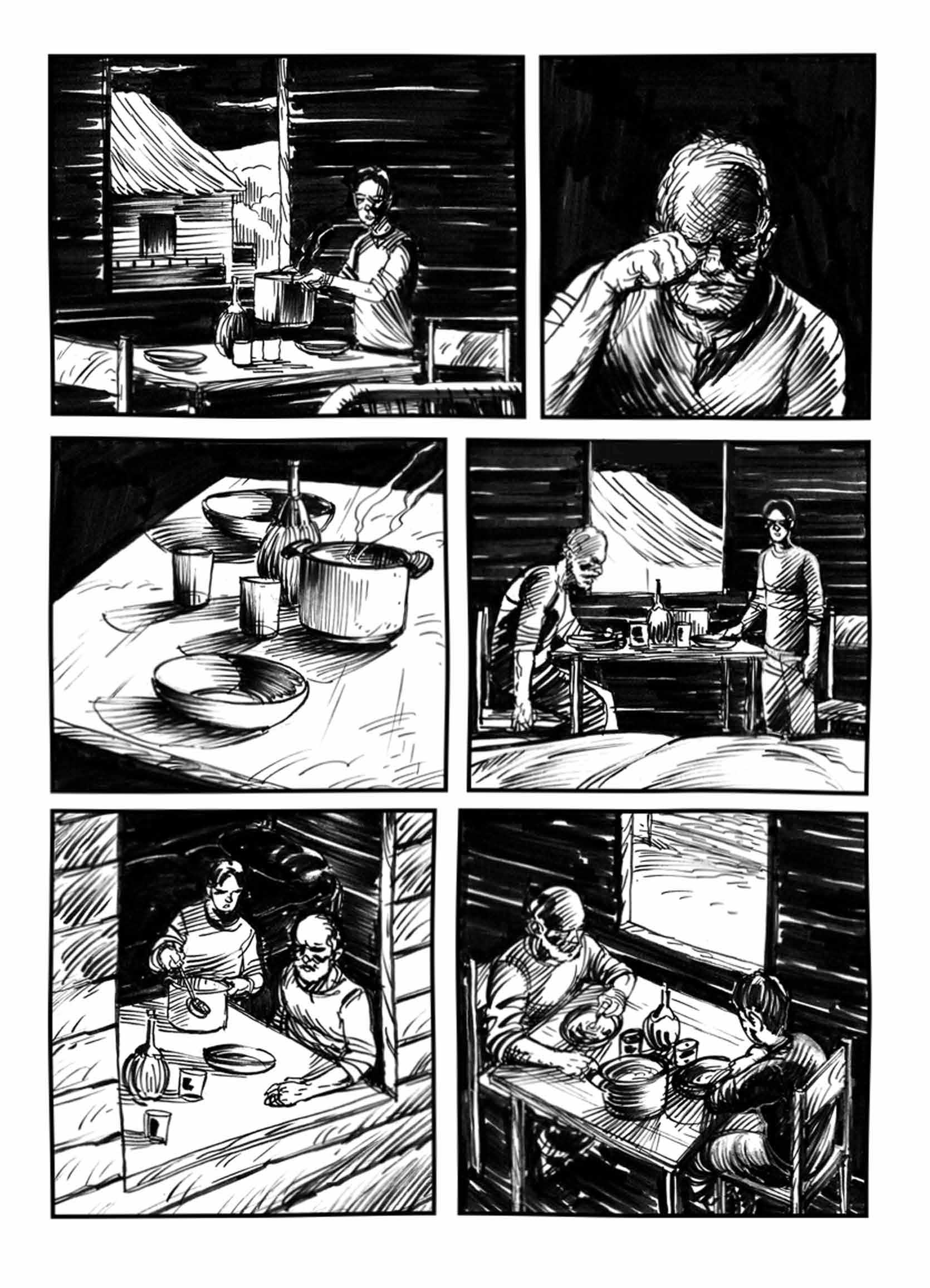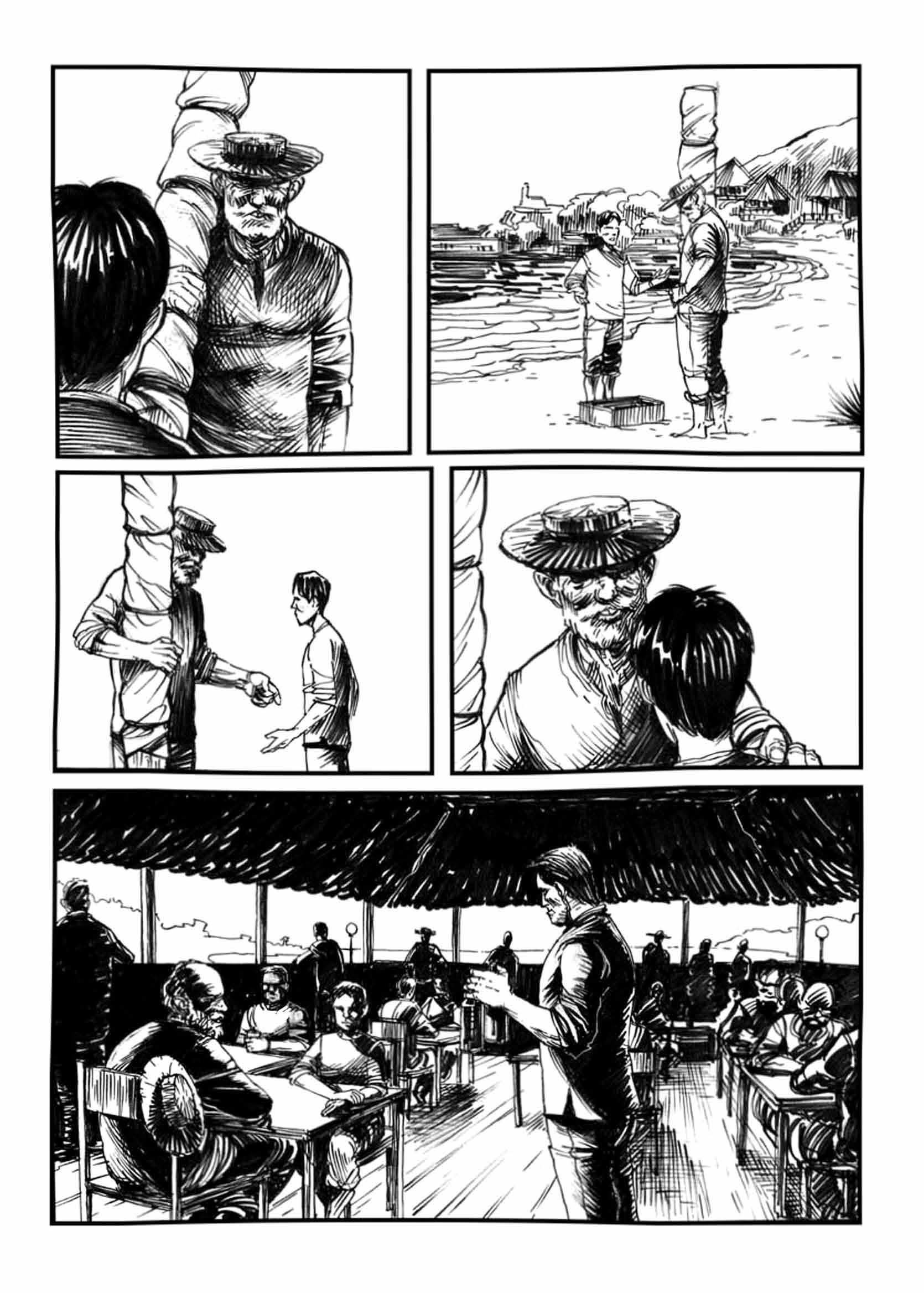 Tre soli protagonisti, Santiago, Manolin e il Marlin, il resto è solo mare ed emozioni. Per questo motivo mi sono avvicinato con il massimo dell’umiltà all’opera. Ho cercato di scrivere una sceneggiatura semplice, senza voli pindarici o trasfgurazioni, solo il mare, l’uomo e il suo destino tenendo presente che la maggior parte delle scene vedono il solo Santiago come protagonista senza azioni particolari. Ho cercato quindi, per non stancare il lettore, di muovere le inquadrature pur optando per una gabbia classica più facile da leggere (e che rientra nel criterio di semplicità che mi sono imposto sin dall’inizio, il tutto a favore della storia).