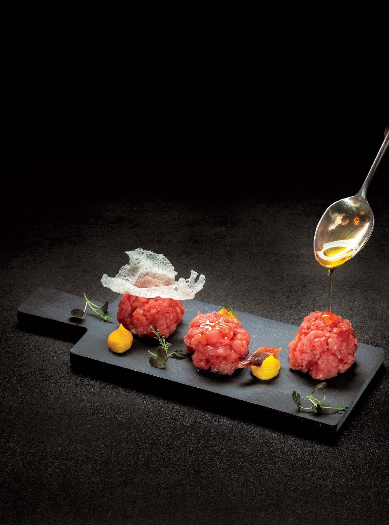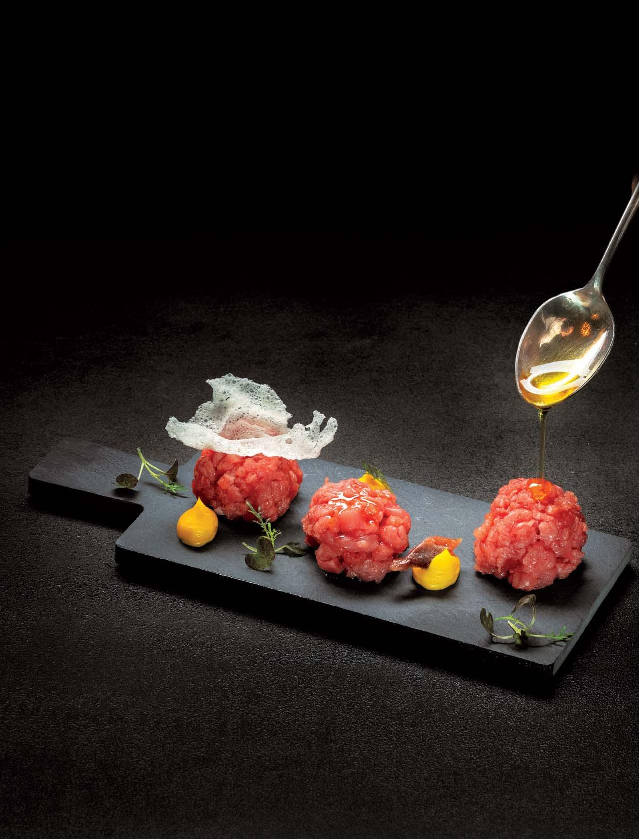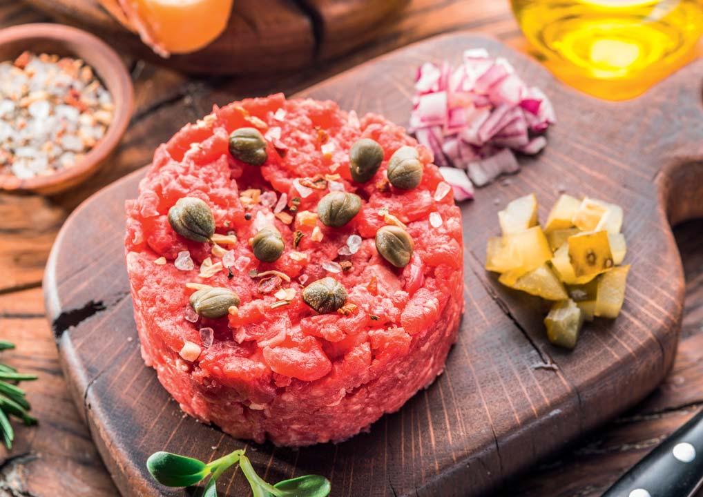 Una volta trovata carne di ottima qualità, bisogna tagliarla nel modo giusto: col coltello, in modo irregolare, a pezzetti di 1 cm, bilanciando molto bene parte grassa e magra. Questo perché il grasso, sciogliendosi, deve ammorbidire il muscolo (altrimenti il calore lo renderebbe stopposo) e al contempo rilasciarvi gli aromi (che per la maggior parte