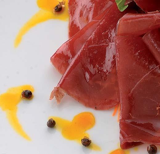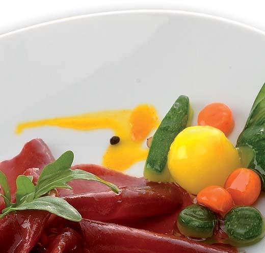 Nella foto una delle nostre “Ricette Consigliate”: Bresaola di Cavallo con Perle di Verdure e Salsa Zafferano Esecuzione: con lʼapposito scavino realizzare le perle di verdure e lessarle. Condire con unʼemulsione di succo di limone, olio, zafferano, pepe ed un pizzico di sale. Servire la bresaola di cavallo su un letto di rucola e guarnire il piatto.