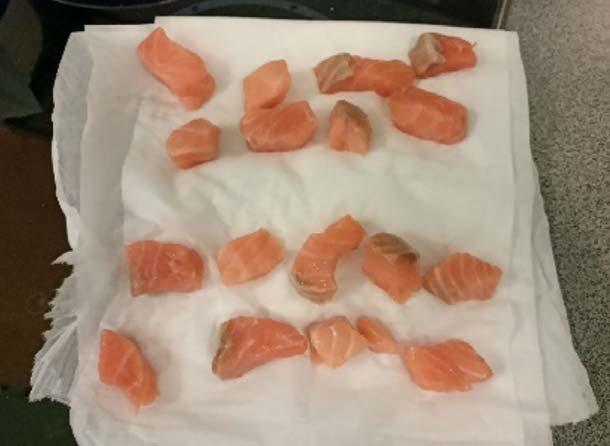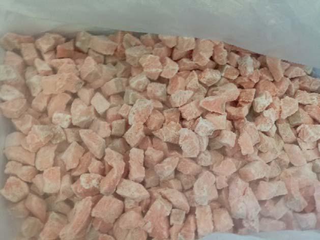 Per la surgelazione IQF, Linde ha sviluppato una tecnologia brevettata che si presta ottimamente per i prodotti ittici quali gamberetti, cubetti o sticks di salmone, tonno, pesce spada, pesci di media e piccola taglia, ecc… Il sistema Cryoline CW, un tunnel criogenico per IQF, utilizza un nastro trasportatore dotato di un meccanismo di agitazione meccanica che crea un movimento “a onda”. Questo permette agli alimenti di essere continuamente agitati e quindi mescolati durante il trasporto e surgelati attraverso l’irrorazione diretta di azoto liquido. A sinistra: cubetti di salmone surgelati in IQF e successivamente decongelati (in basso).