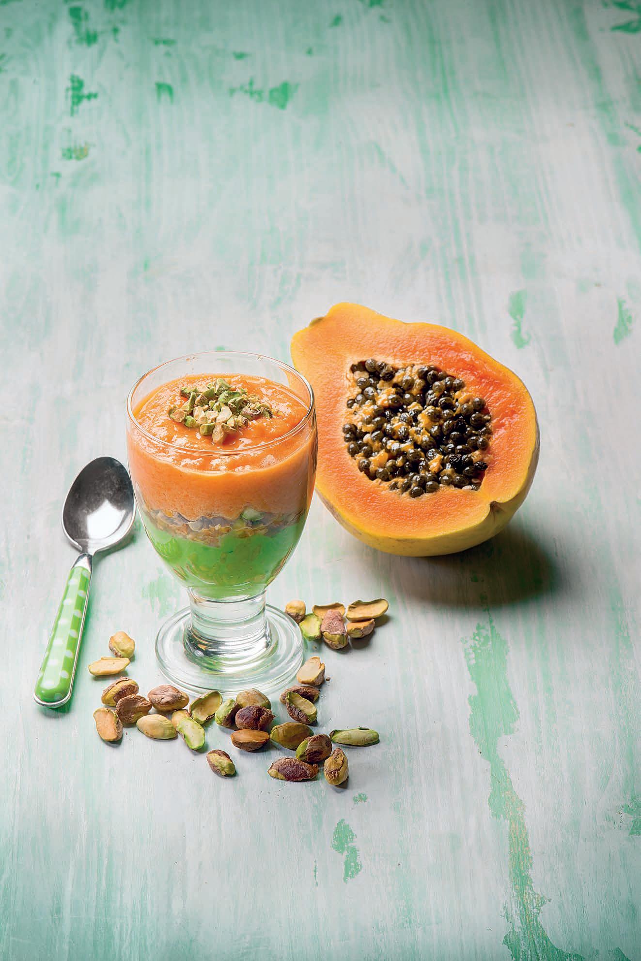 2 Frulla la polpa della papaia (ricavata scavandola con un cuc chiaino, dopo aver eliminato i semi) con la ricotta, il succo dell’aran cia e la stevia rimasti. Quando hai ottenuto un mix cremoso, distri buiscilo nei bicchierini e servi completando con i pistacchi rimasti. Nota: la papaia ha un Ig elevato (55) ma, essendo ricca di pro prietà salutari, si può usare comunque, abbinandola a cibi proteici.