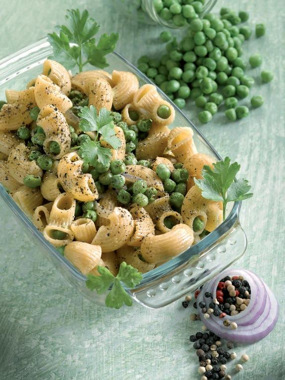 chiaio di acqua e i piselli sur gelati lessati. Cuoci per 15 minuti, unisci la pasta scola ta al dente, fai saltare e servi spolverizzando con il pepe nero macinato al momento.