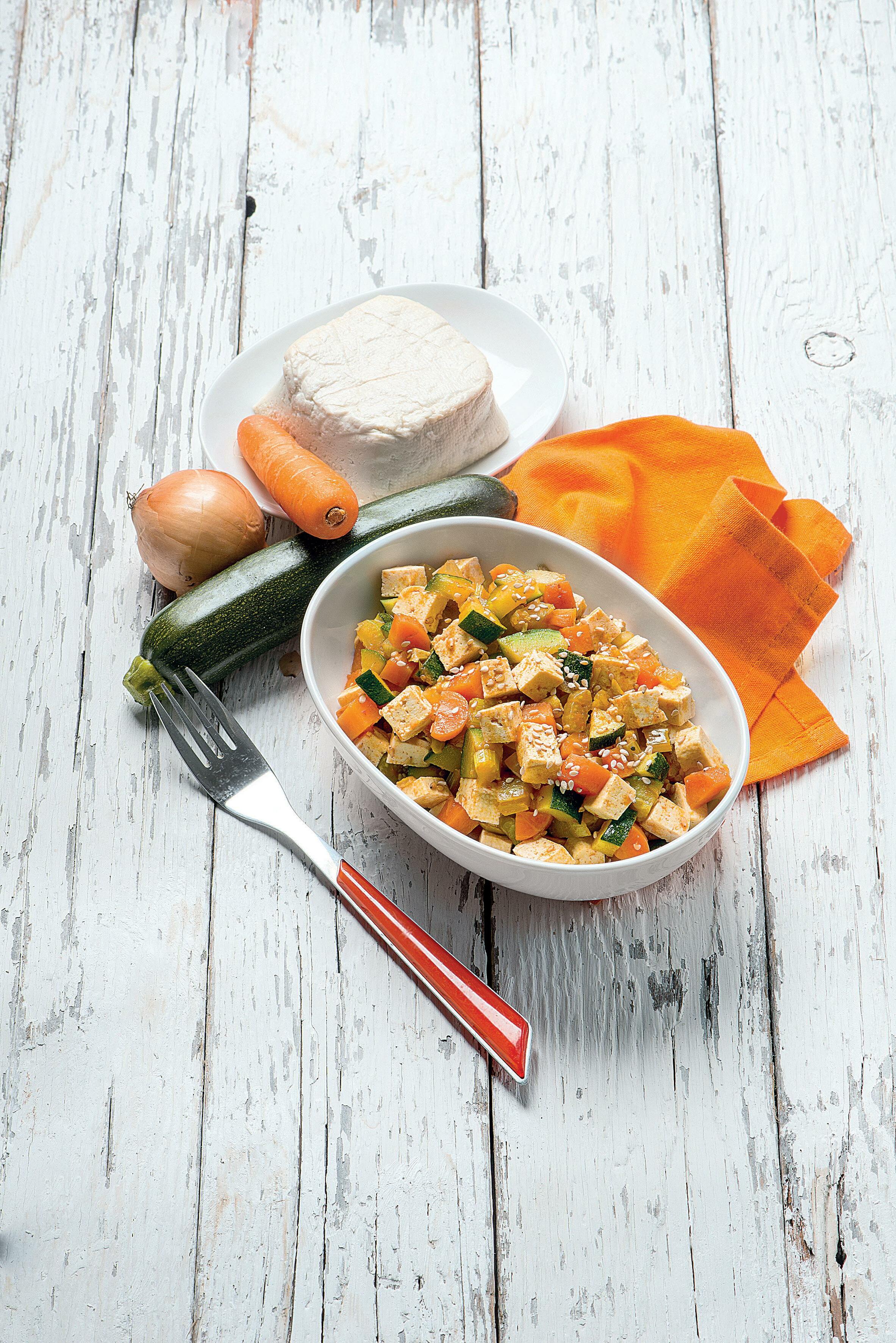 2 Unisci il concentrato di pomodoro diluito in 3 cuc chiai di acqua, fai cuocere per qualche minuto e uni sci il tofu a cubetti.