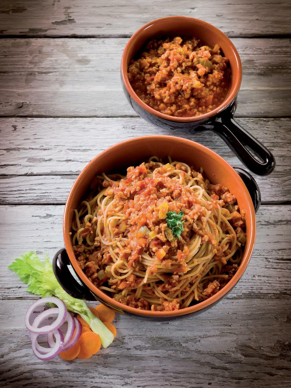 1 Metti il granulato di soia in acqua calda e lascia che si reidrati fa cendolo bollire per 10 minuti. Quindi scolalo, lascialo intiepidire e striz zalo. Fai scaldare l’olio in un tegame e versa lo scalogno nel recipien te. Fai appassire lo scalogno mescolando con un cucchiaio di legno, facendo attenzione a non farlo appassire troppo, quindi unisci il gra nulato di soia reidratato.