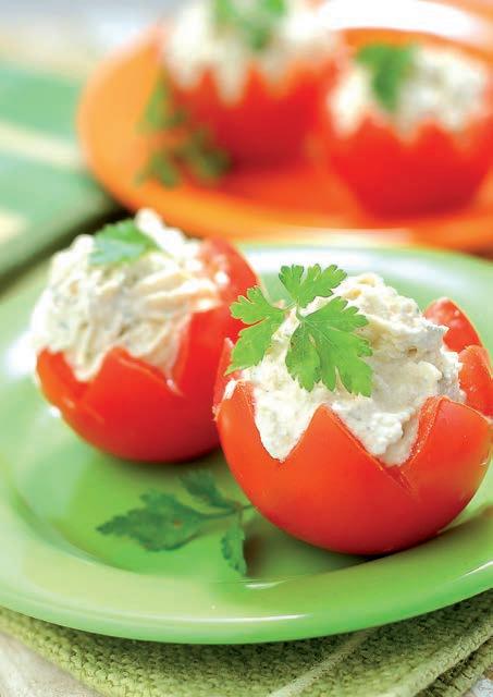 3 Decora i pomodorini con foglioline di prezzemolo o di menta e servi subito in tavola.