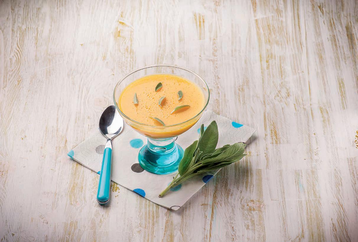 3 Continuando a mesco lare porta quasi a bollore, quindi togli dal fuoco e la scia raffreddare mescolan do ogni tanto. Versa in 4 bicchieri di servizio, fai so lidi care e servi decoran do con foglioline piccole di salvia.