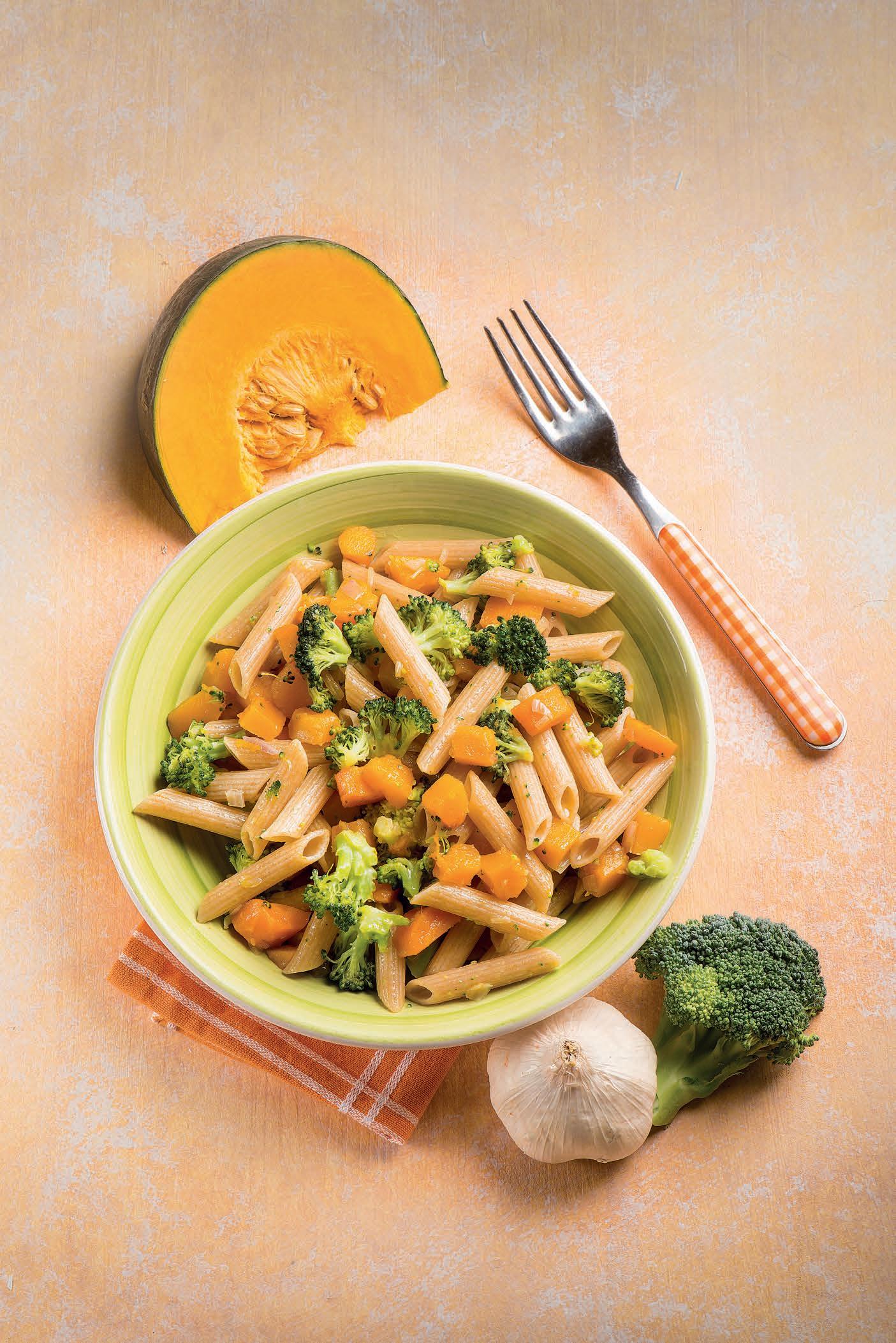 3. Scola la pasta al dente con i broccoli e versali nel tegame con zucca e carota. Mescola con cura, per insaporire bene, quindi servi. Completa il pasto con 100g a porzione di tofu alle erbe tagliato a dadini e saltati in padella con un lo d’olio, 1 presa di curcuma e una di zenzero in polvere.