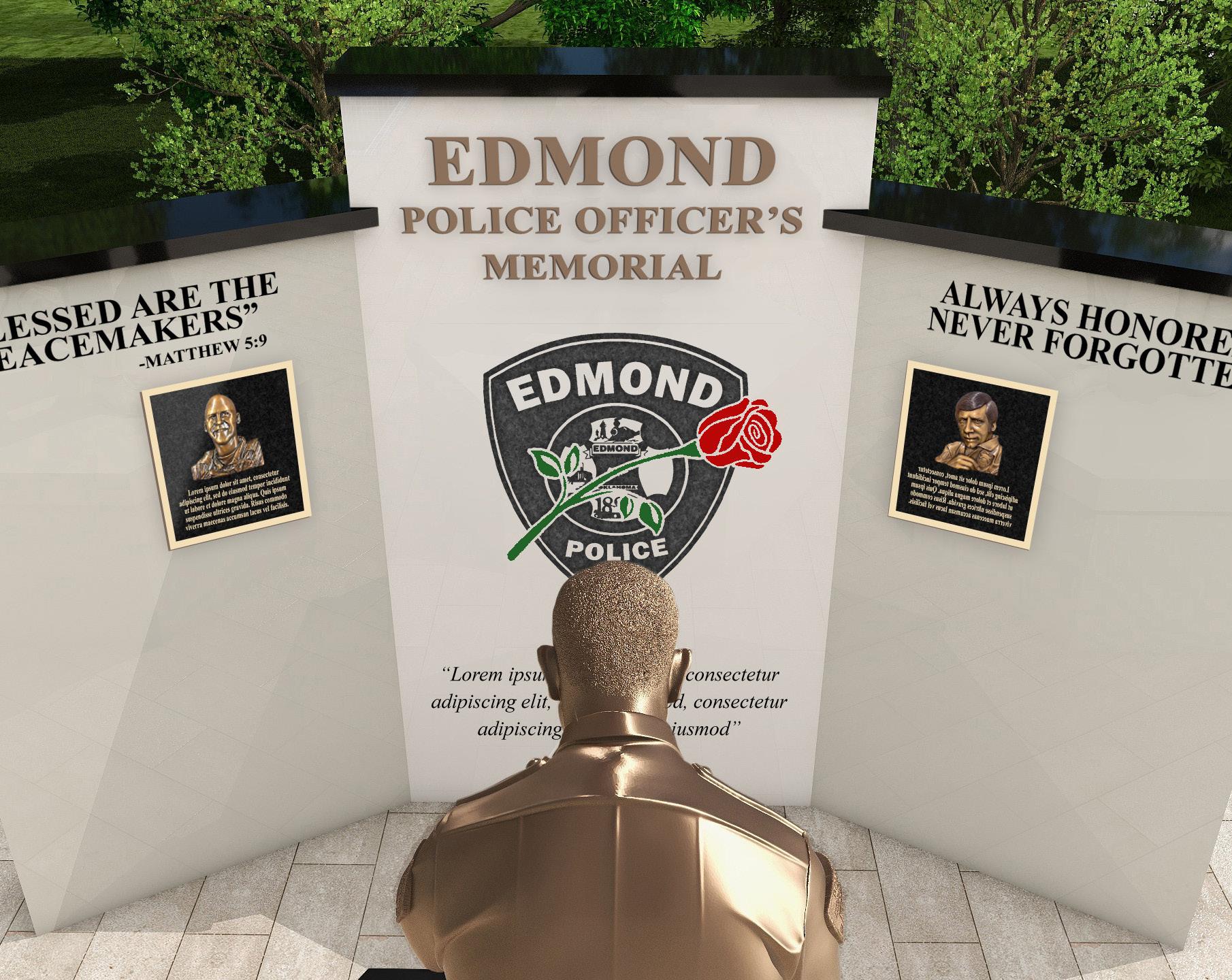 Consisting of a granite wall for fallen officer names, and a bronze statue of an officer kneeling on a granite pedestal, the memorial will serve as a permanent reminder of all police officers who give the ultimate sacrifice for our community. The structure will be located on the grounds of the Edmond Police Department in an area that can be viewed from the street, and easily accessed by the public.
