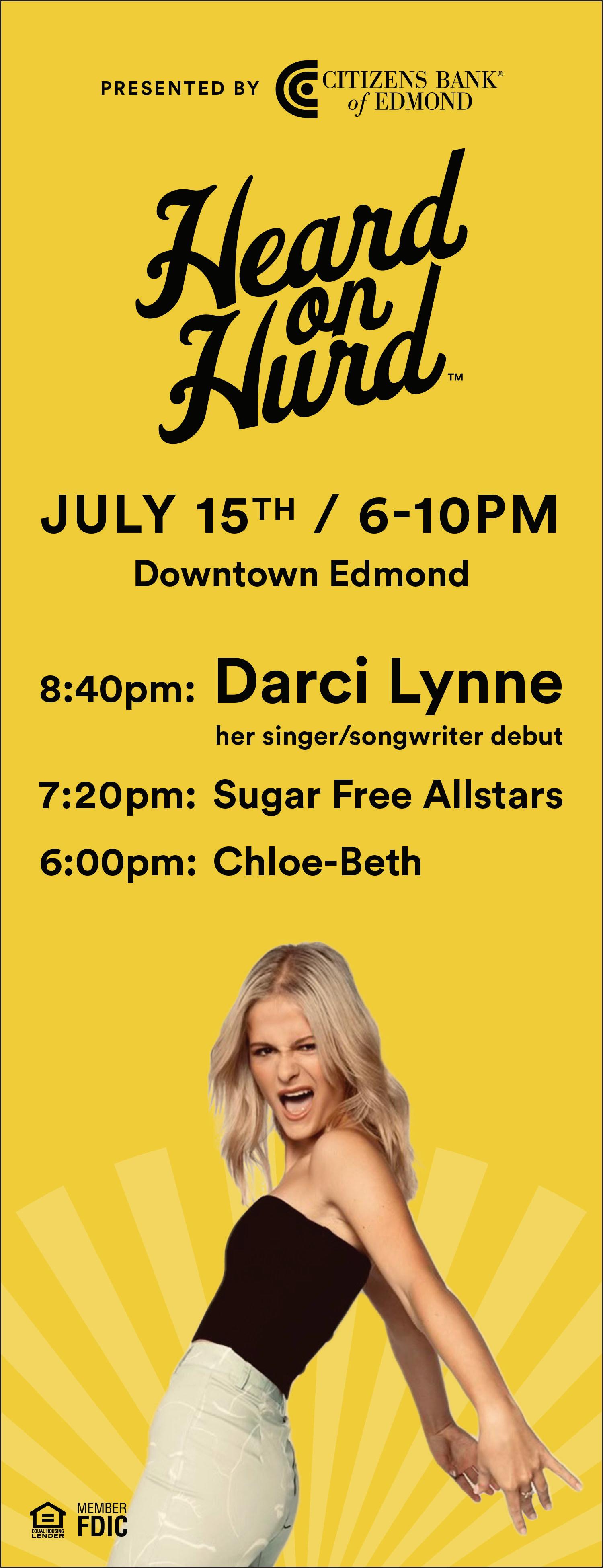 “Citizens Bank of Edmond is thrilled to present Edmond’s own Darci Lynne, as well as Sugar Free All Stars, and Chole Beth to the Heard on Hurd stage in July! This is a night you won’t want to miss,” said Jill Castilla, President and CEO of Citizens Bank of Edmond and founder of Heard on Hurd.